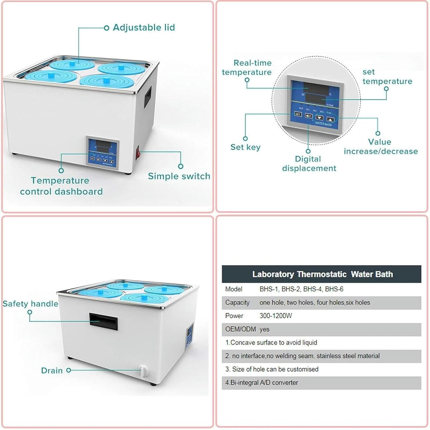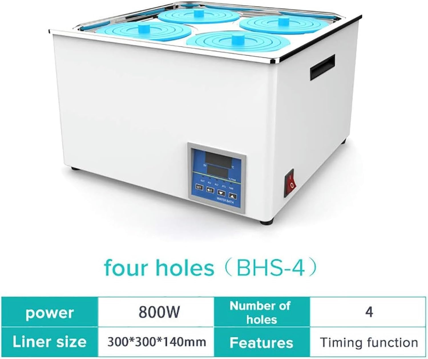 Model Number:The thermostatic water bath is widely used in drying,distillation, concentration, dipping in chemical reagents,pharmaceutical and biological products, can also be used for constant heating water and other temperature test, is a biological, genetic, environmental protection, medicine,aquatic products, health science, biochemistry laboratory,education and scientific research tool.Digital control and display: built-in advanced chip system, automatic temperature control and constant temperature. The clear LED screen displays preset and real-time temperature. Easy to set buttons.Temperature: high quality 304U stainless steel heating rod, durable. Temperature control range indoors can reach 99.9℃, constant temperature resolution 0.1℃.Removable cover: The steel cover is removable to suit different sizes and types of flasks for experiments.Specification:Model: 4HolesTemperature range: room temperature to 100°CTemperature increment: 0.1°CPower: 800WInner wall material: stainless steelTiming function: yesDigital display function: yesLiner size:300*300*140 mmWeight:6.35kgPackage Contents:1 x digital water bath1 x stainless steel cover1 x power cord1 x carrier1 xPP cover ring1 x manualNote:1.This product is taken in kind,Due to factors such as light and equipment, there are some color differences.2.Due to the different measurement gestures, the dimensions may vary.