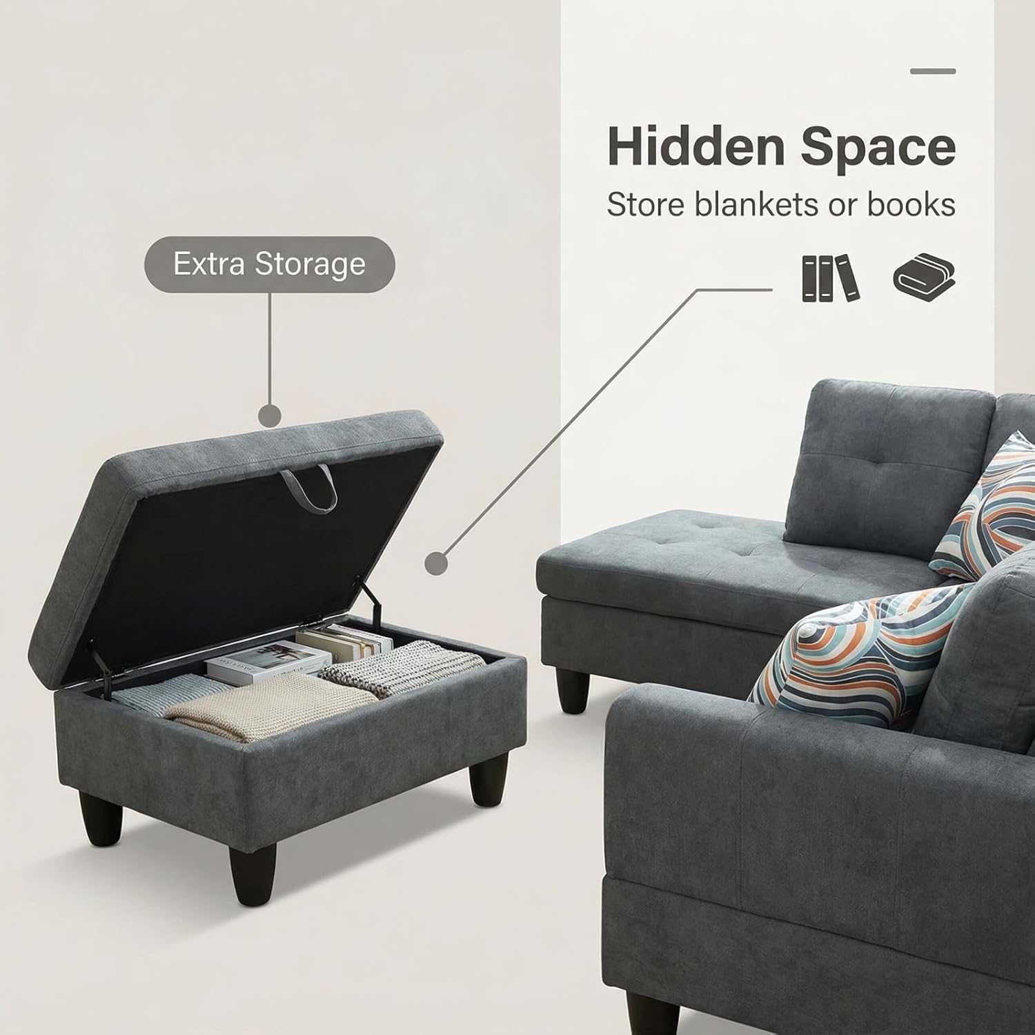 Trygoal Fluffy Fabric Sectional Couch, L-Shape Sofa with Storage Ottoman, Modern 3-Piece Sofa Set for Living Room, Contemporary Upholstered Couch Set with Solid Wood Frame for Apartment, Dark Grey