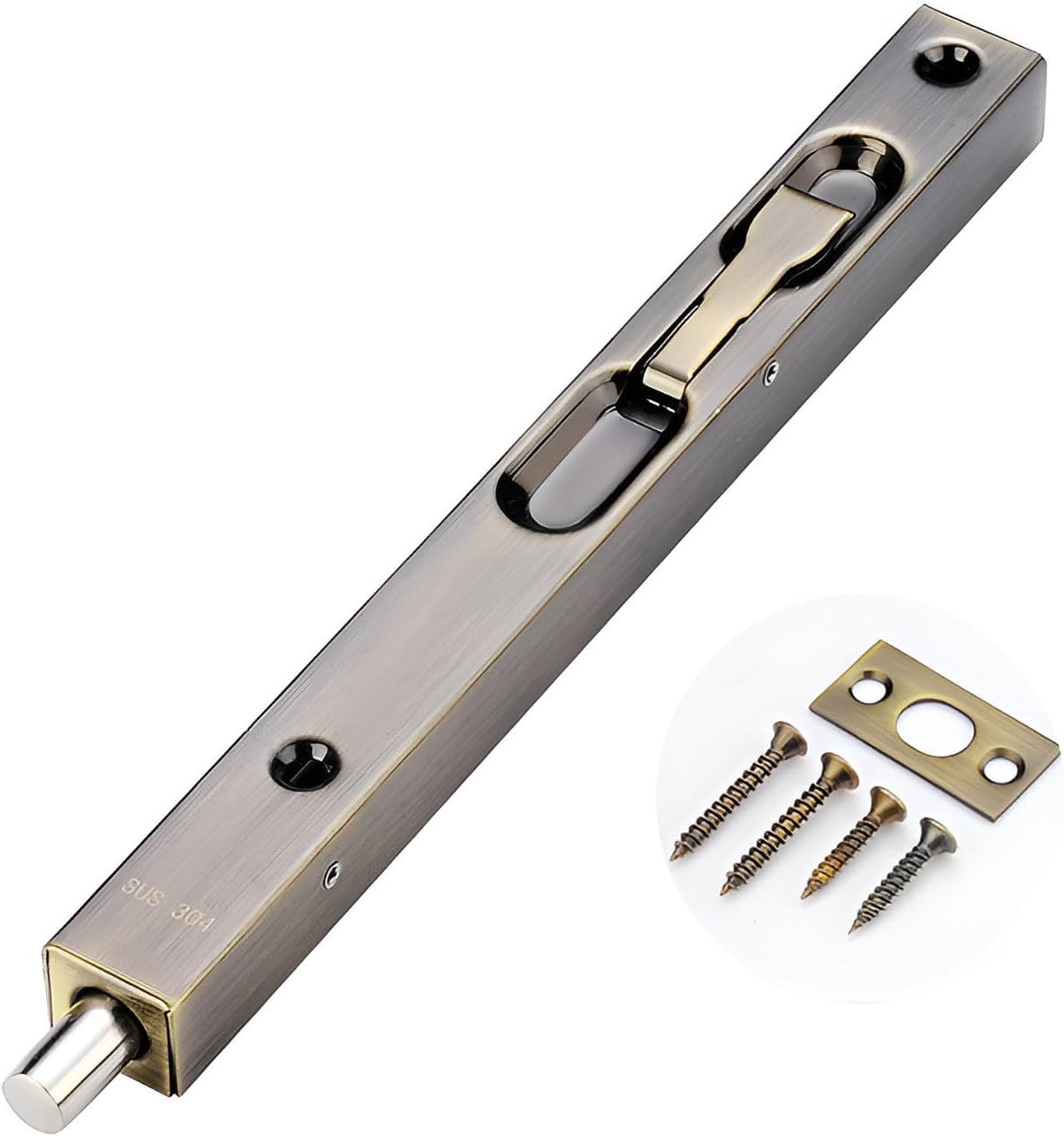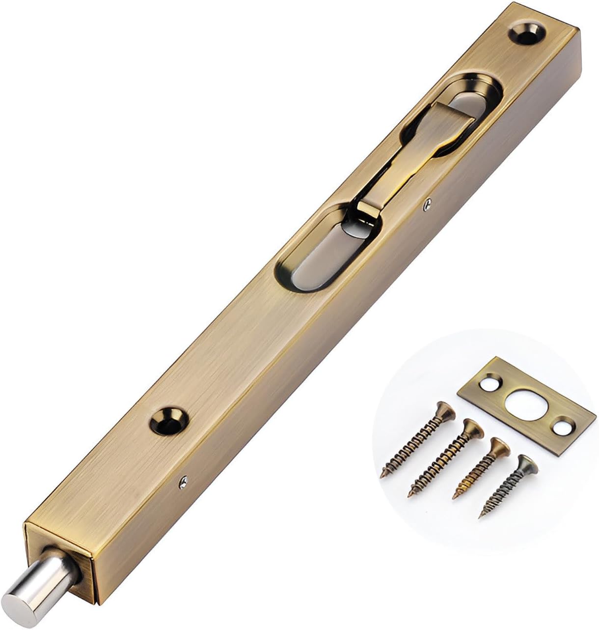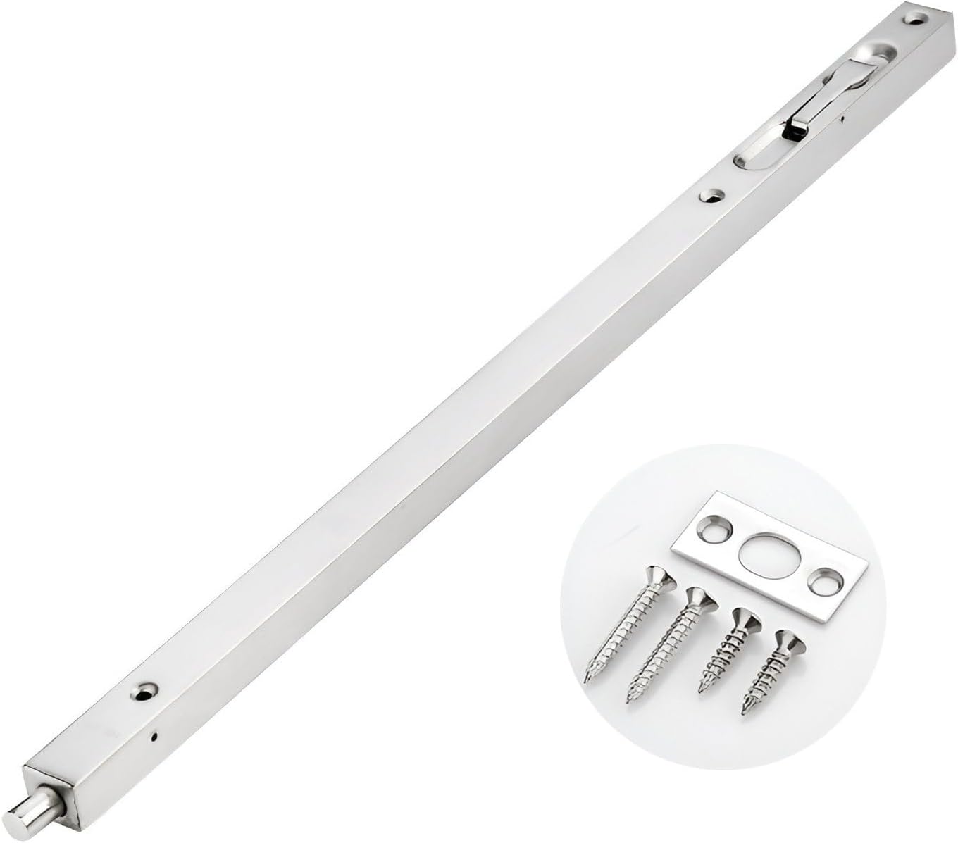 Door Bolts, Be used to secure the opening for composite door,French door or dummy doors. This great small device features automatic holding spring to provide tension for both retracted and projected positions.It often be installed on inactive leaf of double door opening(top and bottom) to offer safety function.Easy to install,comes with rust-proof screws and strikes for installation.Constructed from stainless steel,screws will provide extra strength to engage and interlock firmly so as to be immobile,they are long and sharp enough to be mounted on the door easier,shorten installation time.Product Name: Stainless Steel Door BoltsMaterial: Stainless steelColor: Silver、Black、Red Bronze、Yellow Bronze、Brushed Gold、Green BronzeDimensions: Length = 16in/18in/24in/36in/40in/45in, Width = 0.8" (2.1cm), Depth = 0.7" (1.8cm)Scope of application All kinds of household, hotel, bathroom, wooden doors and other doorsPacking list:a hidden door plug (hidden bolt lock), with installation accessories.Installation Notes:1. Locate the location for the grub bolts (usually on the non-moving leaf of the double-leaf door) and drill the holes.2. Install countersunk bolts to door leaf and tighten each screw.3. Align and drill the marks on the door frame or floor, then tighten each screw.4. Close the door, insert the pins into the holes, and you're done.