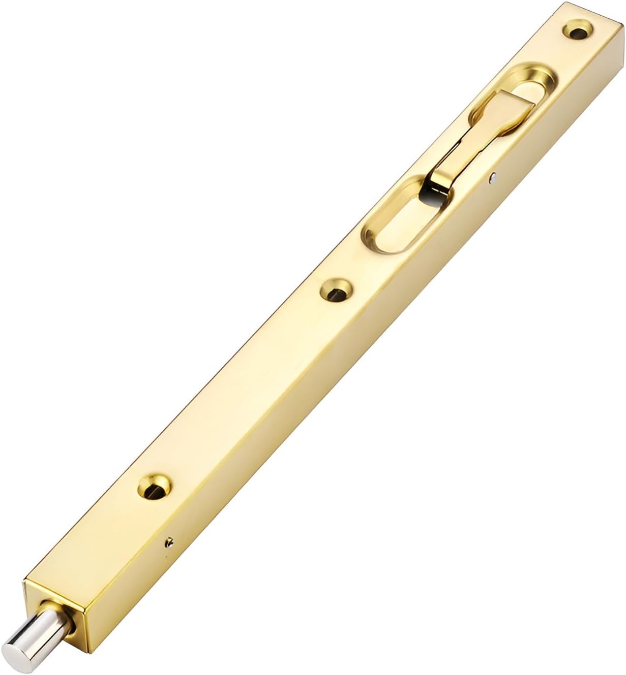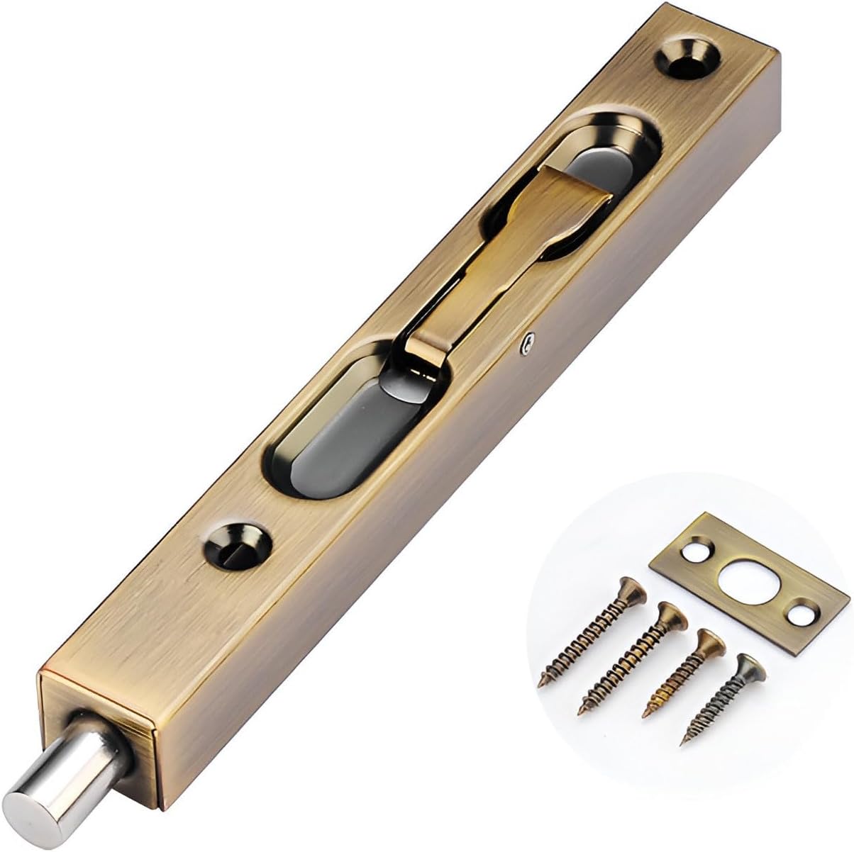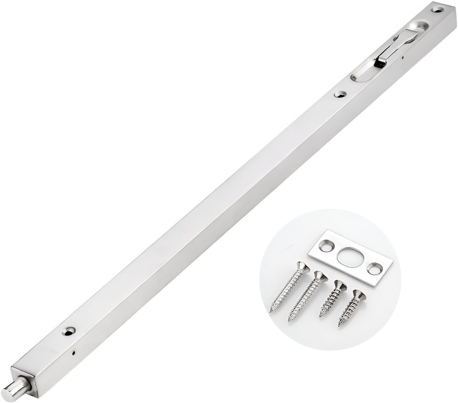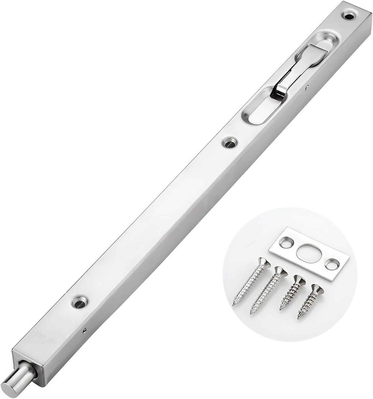 Door Bolts, Be used to secure the opening for composite door,French door or dummy doors. This great small device features automatic holding spring to provide tension for both retracted and projected positions.It often be installed on inactive leaf of double door opening(top and bottom) to offer safety function.Easy to install,comes with rust-proof screws and strikes for installation.Constructed from stainless steel,screws will provide extra strength to engage and interlock firmly so as to be immobile,they are long and sharp enough to be mounted on the door easier,shorten installation time.Product Name: Stainless Steel Door BoltsMaterial: Stainless steelColor: Silver、Black、Red Bronze、Yellow Bronze、Brushed Gold、Green BronzeDimensions: Length = 16in/18in/24in/36in/40in/45in, Width = 0.8" (2.1cm), Depth = 0.7" (1.8cm)Scope of application All kinds of household, hotel, bathroom, wooden doors and other doorsPacking list:a hidden door plug (hidden bolt lock), with installation accessories.Installation Notes:1. Locate the location for the grub bolts (usually on the non-moving leaf of the double-leaf door) and drill the holes.2. Install countersunk bolts to door leaf and tighten each screw.3. Align and drill the marks on the door frame or floor, then tighten each screw.4. Close the door, insert the pins into the holes, and you're done.