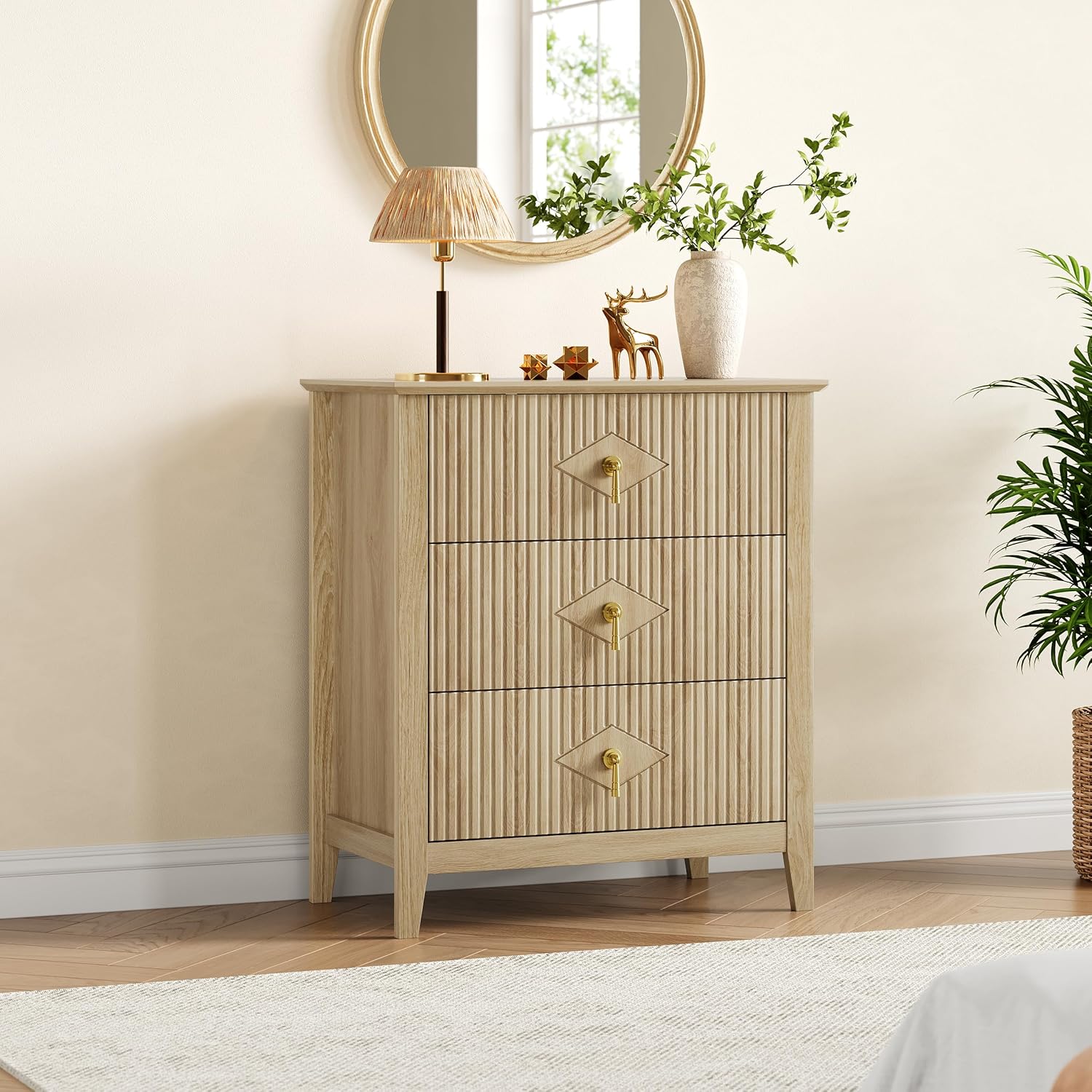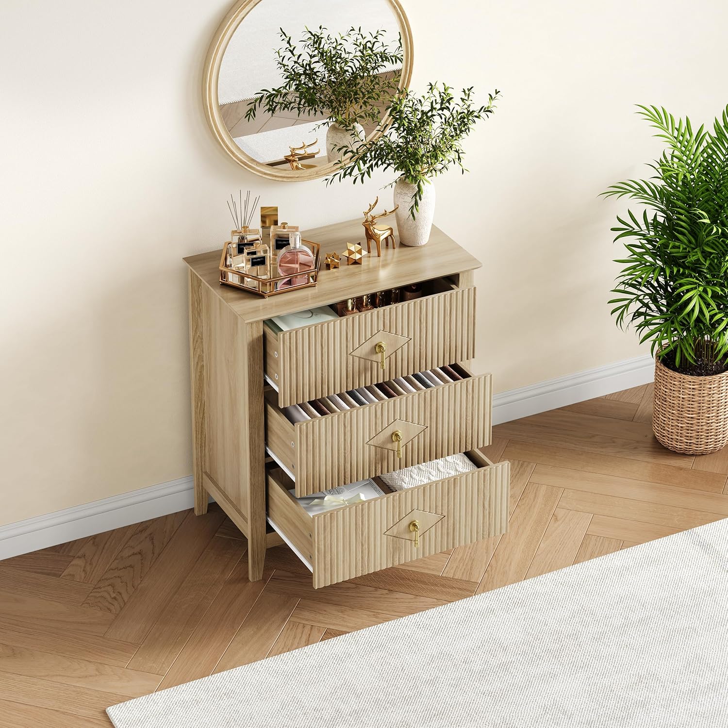 Fluted Nightstand, 27.5" Wide Bedside Table with 3 Large Storage Drawers, Modern Wood Night Stand with Metal Handle, Wooden End Table for Bedroom, Living Rooms, Hallway, Entryways, Closet【Elegant Modern Design】Elevate your bedroom decor with our chic nightstand, featuring a unique wave-like fluted panel that adds depth and sophistication. This piece seamlessly blends texture, elegance, and a contemporary touch to create a focal point in any room【Durable & Scratch-Resistant】Crafted from high-quality MDF and P2 engineered wood with a durable finish, this nightstand is built for everyday life. The scratch-resistant surface and sturdy coated metal handles ensure long-lasting beauty and resilience. It's a practical and beautiful addition to your home that withstands the test of time【Spacious 3-Drawer Storage】Maximize your organization with three deep, spacious drawers, each capable of holding up to 35 lbs. The generous tabletop (supports 150 lbs) is perfect for a lamp, alarm clock, or displaying decor. Beyond the bedroom, it functions perfectly as a living room end table, entryway console, or dorm room dresser, fitting effortlessly into various spaces【Stable & Secure with Anti-Tip Safety】Your safety is our priority. This nightstand includes a built-in anti-tip device and can be securely anchored to the wall, providing peace of mind, especially in homes with children or pets. The sturdy legs and smooth-gliding drawer rails offer exceptional stability and effortless operation【Hassle-Free Assembly】Get your furniture setup in no time! All necessary tools, clear instructions, and neatly packaged parts are included. Most customers can complete assembly in about 30 minutes. For an even faster setup, using your own electric drill is recommended