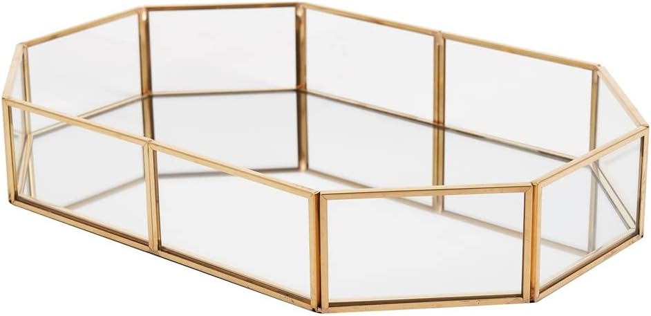 The color is beautiful, the gloss is good, and the texture is good.Safe to use, no odor, impact resistance, corrosion resistance, compact and .Easy to clean, suitable for cleaning lotions on the market.The surface of the food tray is smooth and not easy to get dirty.Suitable for living room, dining room, bedroom, study and many other scenes.Material: Brass + glassColor: GoldSize: 31.5 x21.5x5 cm,20x14.2x 4.5 cmpackage includes : tray: *1(excluding other demo products)notes:1. Due to manual measurement, please allow 1-3 cm error.2. Due to different computer screen and display , the actual color may be slightly different from the picture.Thanks for your understanding!Perfect for dining tables, coffee tables, dressers or any part of the home.