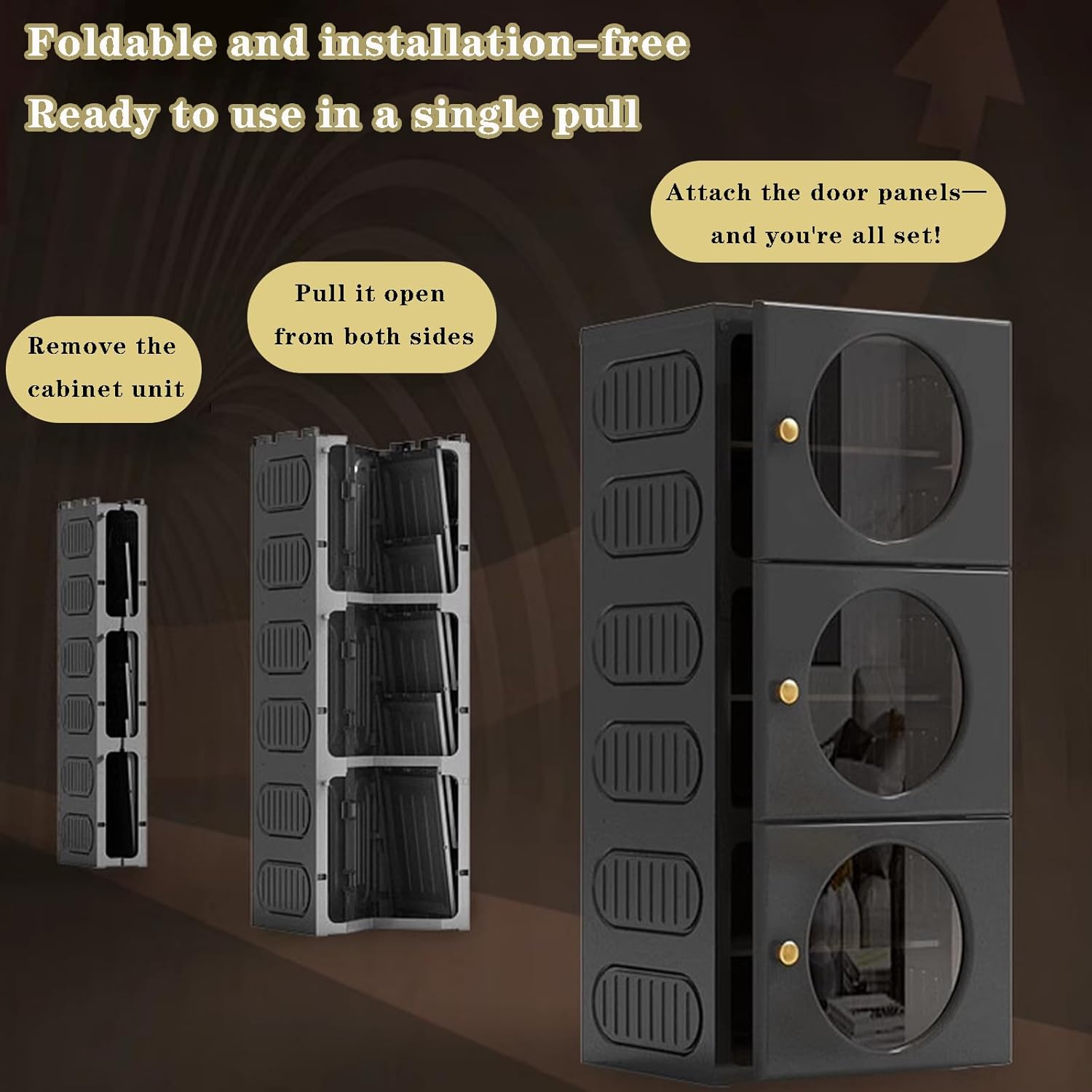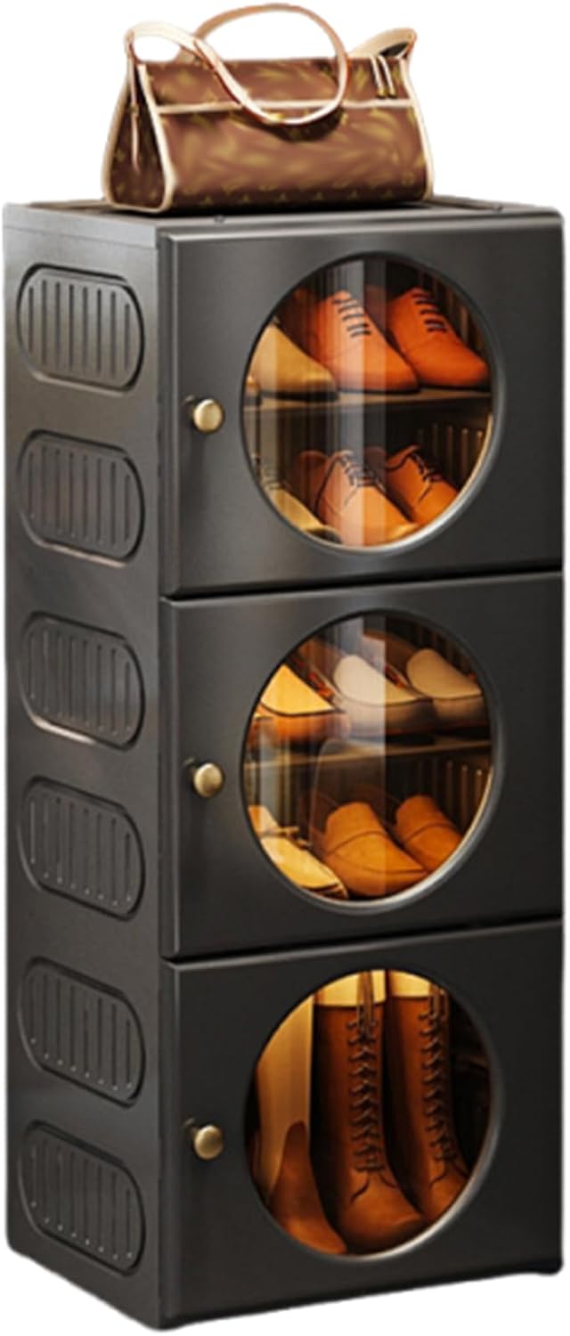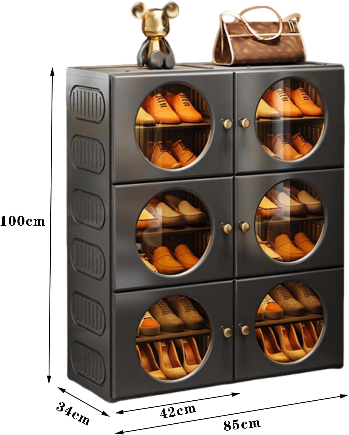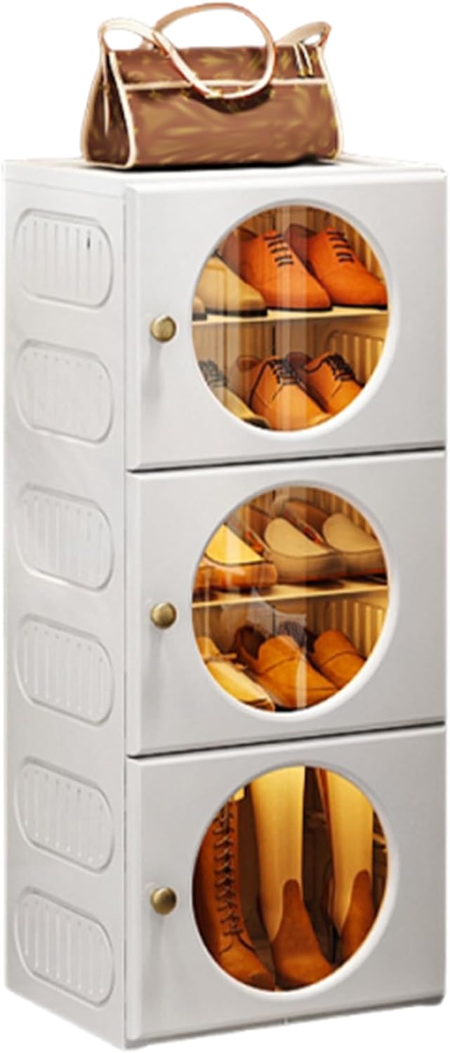 ● The shoe rack features an integrated folding structure that requires no tools for assembly; simply pull and latch it into place. When not in use, it can be folded down for compact storage, taking up minimal space.● The shelves within the shoe cabinet are fully removable and adjustable. The standard 16cm shelf height accommodates high heels and sneakers, while removing a divider creates a maximum clearance of 48cm—perfect for storing tall boots and high-top shoes.● The unit features a magnetic door-latch design that automatically seals the cabinet shut upon closing. A circular transparent window allows you to clearly view the shoes inside without opening the door, ensuring easy access while keeping your footwear clean and dust-free.● Boasting an ultra-slim, narrow profile (with a depth of just 34cm), the shoe cabinet maximizes vertical space utilization without encroaching on floor area—allowing even small apartments to enjoy the benefits of a high-capacity shoe storage solution.● With its matte finish, gold-tone handles, and circular transparent doors, this shoe cabinet exudes a sense of "light luxury" and sophistication, making it the perfect complement to a wide range of interior design styles—including modern, minimalist, and upscale contemporary aesthetics.Note: As product dimensions are measured manually, a margin of error of 1–3 cm may occur; please refer to the actual product for exact measurements.Please be aware that product colors may appear slightly different due to variations in lighting, monitor settings, mobile device displays, viewing angles, and individual color perception.