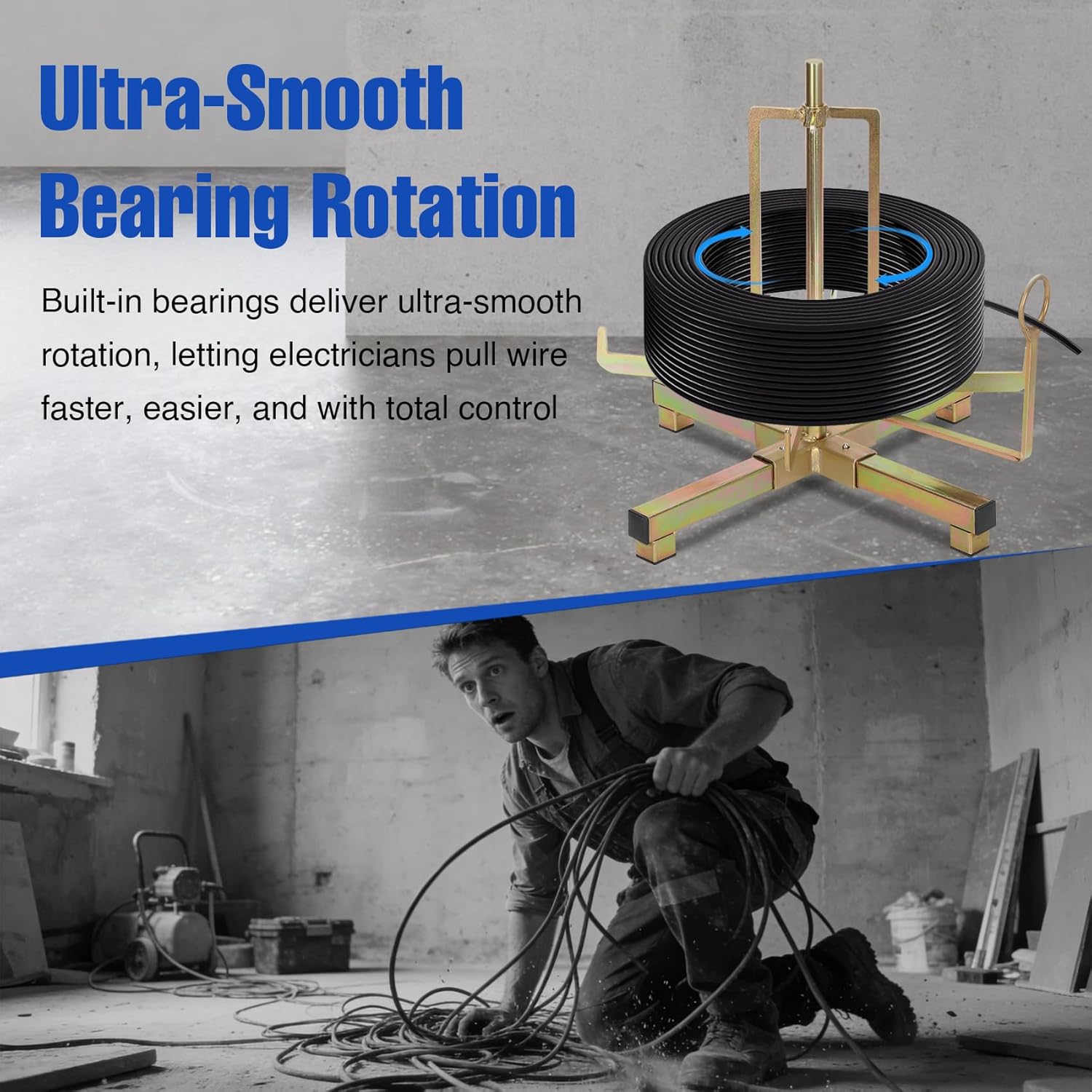 ★Specifications:Name: Foldable Wire Spool RackBrand: benutMaterial: Heavy-Duty SteelColor: GoldInstallation Type: Wall-Mounted & Floor-StandingLoad Capacity:Wall Mounted: Up to 50 lbs / 22.7 kgFloor Standing: Up to 100 lbsMax Reel Length: Up to 800 ftDesign Features: Foldable Structure, Built-In Bearings, Quick-Lock BaseApplication: Electrical wiring, cable dispensing, jobsite and workshop use★Features:Upgrade your wire handling workflow with this heavy-duty foldable wire spool rack, engineered for electricians, contractors, and professionals who demand smooth performance and jobsite reliability. Designed with built-in bearings, this rack delivers ultra-smooth, low-resistance rotation, eliminating the jerky movement and effort common with friction-based spool racks. Wire feeds out evenly and under full control, helping reduce fatigue and significantly improve efficiency during long pulls.The rack features an upgraded quick-lock stable base that installs in seconds and stays firmly in place during operation. Whether wall-mounted or floor-standing, the reinforced structure prevents wobbling or shifting while dispensing, keeping reels stable and cables organized for safer, more precise work.For maximum flexibility, this wire spool rack supports dual installation options. Use it as a wall-mounted rack to save valuable floor space in workshops and vans, or set it up as a floor-standing unit for higher load capacity and mobile jobsite use. It supports up to 50 lbs when wall-mounted and 100 lbs when floor-standing, accommodating wire reels up to 800 feet in length.The foldable, space-saving design allows the rack to collapse flat when not in use, making storage simple and efficient. Lightweight yet rugged, it’s easy to carry between job sites, transport in work vehicles, or store neatly in tight spaces without clutter.Built from thick, powder-coated steel, this durable wire spool rack resists corrosion, scratches, and wear, ensuring long-lasting performance in demanding environments such as workshops, garages, construction sites, and outdoor job locations. An upgraded smooth cable guide with rounded edges protects wire insulation from abrasion, delivering clean, damage-free dispensing every time.Ideal for electrical wiring, equipment installation, maintenance work, and professional cable management, this wire spool rack is a must-have tool for anyone looking to work faster, cleaner, and more efficiently.⚠Notes:✔Please allow slight measurement deviations due to manual measurement.✔Actual color may vary slightly due to lighting and display differences.✔If you have any questions or issues with the product, please contact us for timely support.