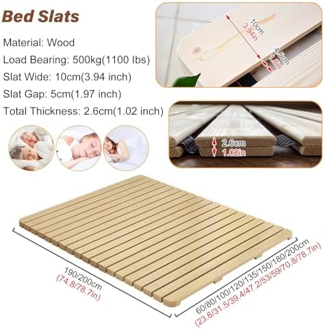 Are you seeking a stylish yet functional bed frame to enhance your sleep quality? Our minimalist wooden bed slats are expertly designed to offer the ideal balance of comfort and support, ensuring you enjoy a restful night’s sleep free from annoying noises. Crafted from durable pine wood, these bed slats can support up to 500kg (1100 lbs), making them a reliable choice for various mattress types. Key features include slats measuring 10cm (3.94 inches) wide with a spacing of 5cm (1.97 inches) and a thickness of 2.6cm (1.02 inches). This design not only provides ample support but also promotes air circulation to keep your mattress fresh and comfortable. Benefits of our wooden bed slats: - Thickened anti-skid pads create a stable and quiet foundation for your mattress, allowing for uninterrupted movement. - Ideal for replacing broken or damaged slats, they help prevent mattress sagging while extending the lifespan of your bedding. - Rounded edges and corners enhance safety, making them suitable for all family members, including children and seniors. - Their versatile design fits perfectly in lofts, low-clearance, or sloped ceiling bedrooms, maximizing your available space. - Easy to store, our slats can be rolled up and folded, offering convenience for those who need to save space. Installation is straightforward, with evenly spaced slats secured by fabric banding, allowing for quick and effortless setup. Package includes: 1× Wooden Bed Slat (Bed Frame Not Included). Please note: - A slight odor may be present initially but will dissipate within a few days. - Confirm the size of the slats before purchasing, as there may be a minor size deviation of 1-3cm due to manual measurement. Elevate your sleep experience with our high-quality wooden bed slats and enjoy a more comfortable, rejuvenating night's rest.