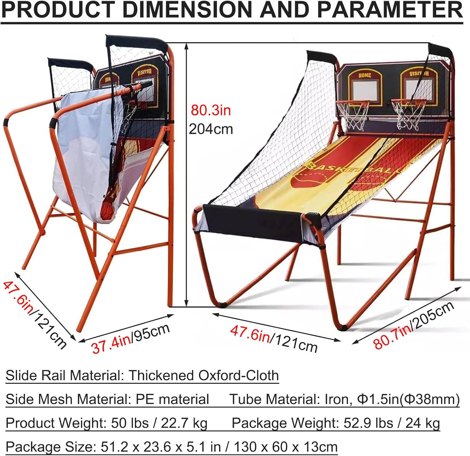◐ Ready to bring arcade excitement to your game room?◐ Imagine boosting celebrations with lively basketball matches?◐ Experience pro-style basketball with electronic scoring, 8 game modes, and a sturdy, space-saving foldable design for all ages.▶ PRODUCT SPECIFICATIONS:- Product Name: Double Shooting Machine Indoor- Tube Material: Iron, Φ1.5in(Φ38mm)- Product Size: 47.6 x 80.7 x 80.3 inch / 121 x 205 x 204 cm- Folding Size: 80.7" x 47.6" x 37.4" / 205 x 121 x 95 cm- Product Weight: 50 lbs / 22.7 kg- Package Size: 51.2 x 23.6 x 5.1 in / 130 x 60 x 13cm- Product Weight: 52.9 lbs / 24 kg▶ PACKING LISTS:- 1 x Double Basketball Shooting Machine- 5 x No.3 Basketball- 1 x Inflatable Needle- 1 x English Instruction▶ NOTICES:✔ Please understand that slight dimensional errors may exist due to manual measurement.✔ Color differences may occur due to different monitors; please refer to the actual product.