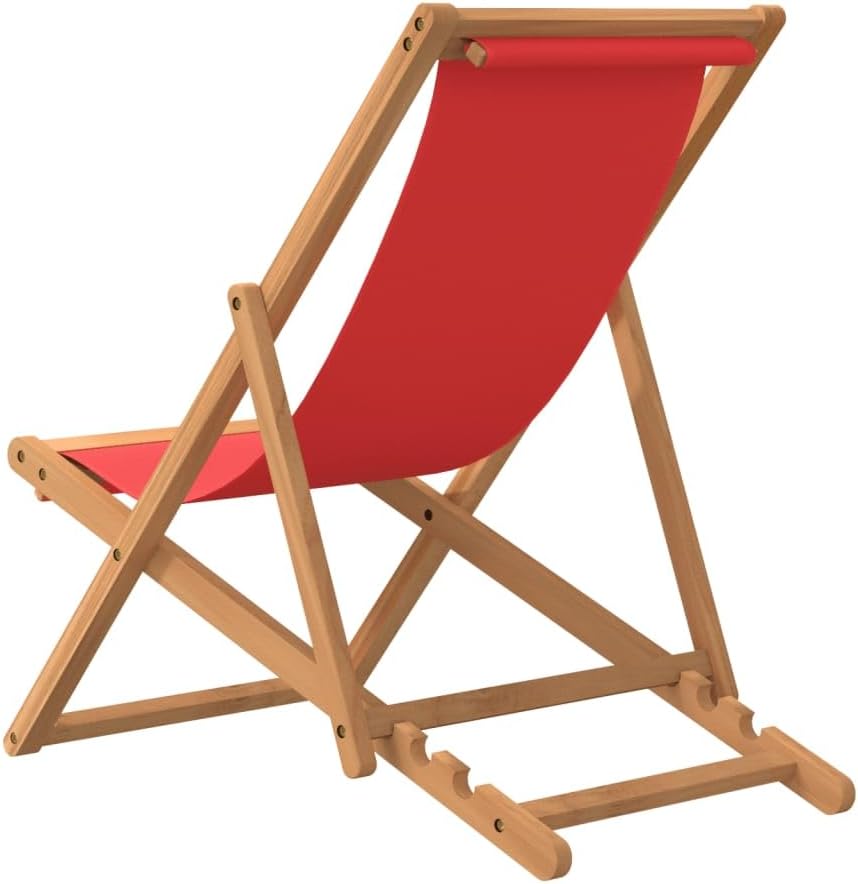 Patio, Lawn & Garden / Patio Furniture & Accessories / Outdoor Furniture / ChairsThis wooden iconic beach chair will be ideal your garden or for the beach or campsite.Constructed from extremely durable teak hard wood, this piece of teak furniture has been seasoned, kiln dried and then fine sanded to give a very smooth appearance. Teak wood is known for its exceptional strength and weather resistance, making it far more suitable for garden furniture than any other kind of wood. Teak wood is the perfect choice if you want to purchase a long lasting piece of garden furniture.The quality fabric seat and backrest add to the chair's seating comfort. The backrest can be adjusted so you can find the most comfortable sitting or lying position. The deck chair folds easily and can be conveniently stowed away to save space. Assembly is easy.Color: RedMaterial: Fine sanded teak hard wood with waterbase finish, fabricDimensions: 22" x 41.3" x 37.8" (W x D x H)Seat height: 15.7"Fabric width: 17.7"Armrests: NoFoldableAssembly required: YesCushion included: No