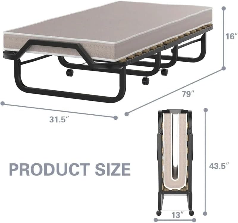 Sturdy and Bed Frame: Made of steel pipes, the folding bed is tightly welded, and with resistance to deformation and bend for maximum sturdiness and extra durability. Moreover, the 15 wooden slats and 4 U-shaped legs make this bed superior in strong bearing capacity.Memory Foam Mattress for Comfort: Made from super-soft, high-density, and foam, the 4'' mattress gives you strong support and comfort during your rest. Additionally, the breathable cover keeps you away from the sultry heat to provide you and your guest with a soft and peaceful sleeping experience.Folding Design with 4 Wheels: With a folding design, you can fold the bed up to a compact size within seconds by only person. Due to the 360 ° swivel wheels, you can transport or carry it to any place easily according to your needs. When not in use, the bed is compact enough to be stored in a wall corner at home or in the trunk of a car for outdoor camping.Fast Assembly and Maintenance: All the clear manual and required tools are included in the package, so you can install it easily under the guidance of detailed instructions. You can set the folding bed up in a short time when a guest comes to stay at your home for a quick solution. The mattress and bed frame are separate for you to change the cover easily.Space-saving for Versatile Usage: The folding bed with mattress is pretty practical to use as a guest bed for adults and kids, a camping bed, an office nap bed, or a daybed. It is suitable for small apartments, unexpected guests, and office naps to provide a comfortable night's sleep.Upholstery Fabric Type:PolyesterProduct Dimensions:79"L x 31.5"W x 16"HSet Includes1*folding bed (no other presentation items included).Warm tips:1. Due to manual measurement, please allow 2-3% error, before you bid, please make sure you don't mind.2. The color may vary due to different displays, please refer to the actual product.Due t