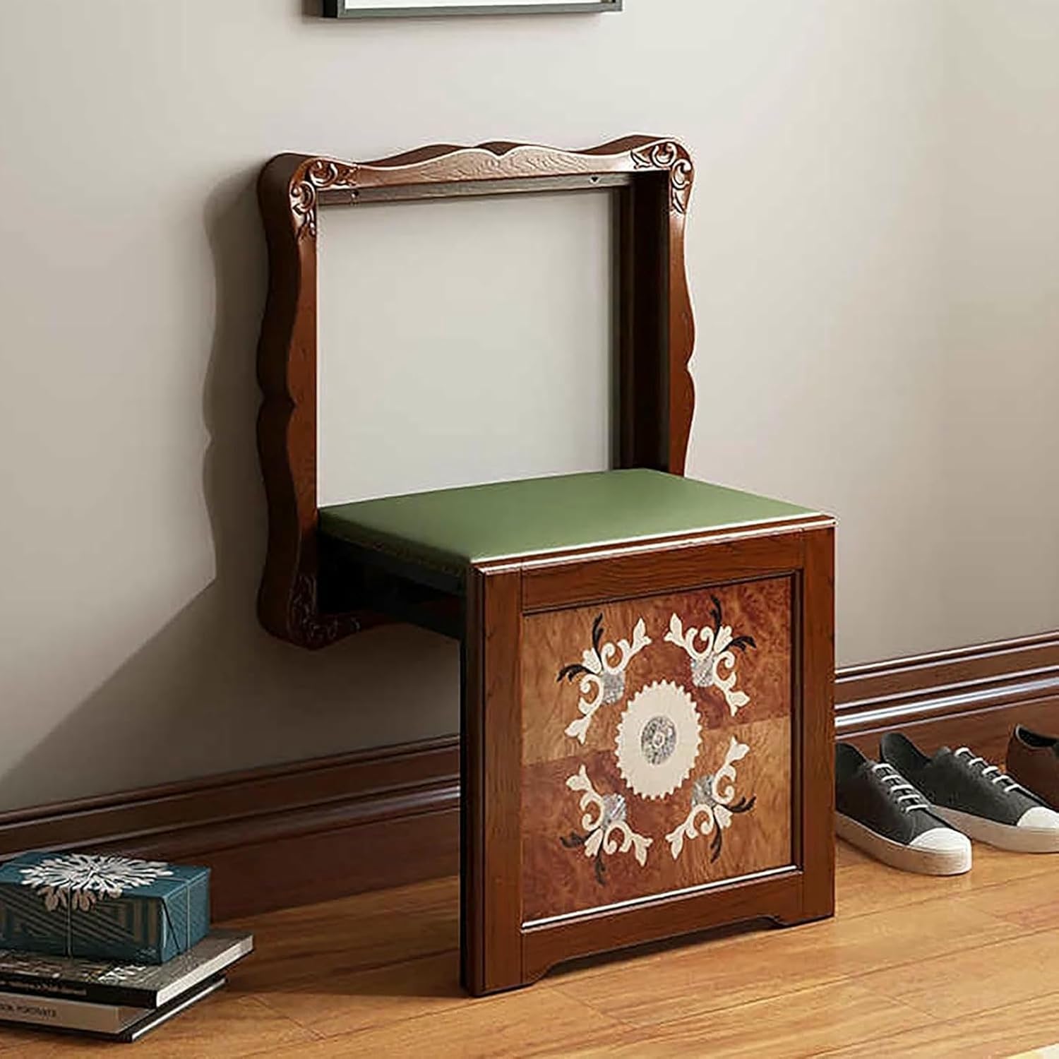 >>>Enhance your space with this Wall Mounted Shoe Changing Stool that combines style and practicality>>>Featuring vintage elegance, it features a beautifully carved frame that pairs beautifully with the smooth wood finish and intricate pattern. The fusion of traditional craftsmanship and modern aesthetics creates a stunning visual centerpiece, adding a touch of art to any room>>>Whether it is an entrance, foyer or corridor, you can use this product to enhance the convenience and comfort of your home【Product Features】*Efficient use of space*After folding, it lies flat on the wall, and the slim profile of 7 cm can save floor space to the greatest extent*Selected materials*Made of durable solid wood with natural texture, more refined*Comfortable sitting feeling*Soft leather cushion provides elastic support, easy to clean and convenient to use【Product Specifications】*Product Material: Solid Wood*Color: Light Brown, Brown*Folded Size: 52*45*7cm/20.5*17.7*2.8in*Installation Type: Wall-mounted【Packing List】1 x Invisible Shoe-Changing Stool