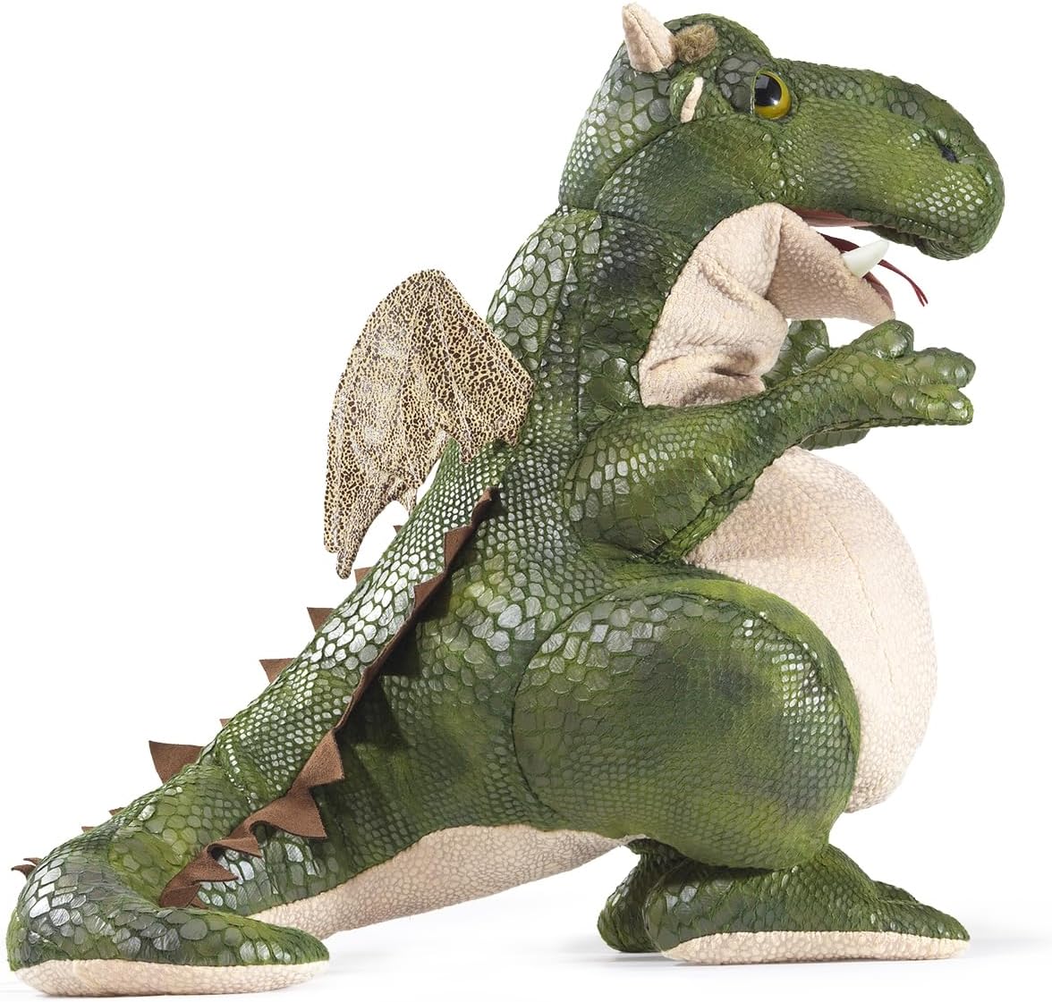 Big fun is packed into the Folkmanis Friendly Dragon puppet! Retro-like whimsy is featured in the big kind eyes, big movable mouth, big scaly body, and not-so-big wings. Perfect for story time and fantasy play adventures! Recommend for ages 3+. 17” Tall. MSRP $62.99 This puppet measures 15 x 13 x 16 inches (LxWxH).Since 1976, Folkmanis has been encouraging young imaginations to blossom with its innovative and engaging specialty puppets, promoting creativity and discovery while winning nearly every industry, child development, and kid-tested award. Folkmanis has grown to become the premier manufacturer of plush puppets worldwide, offering over 200 of the most heartwarming and realistically designed creatures--both exotic and familiar--on the market today. (Birthday: January 2024)
