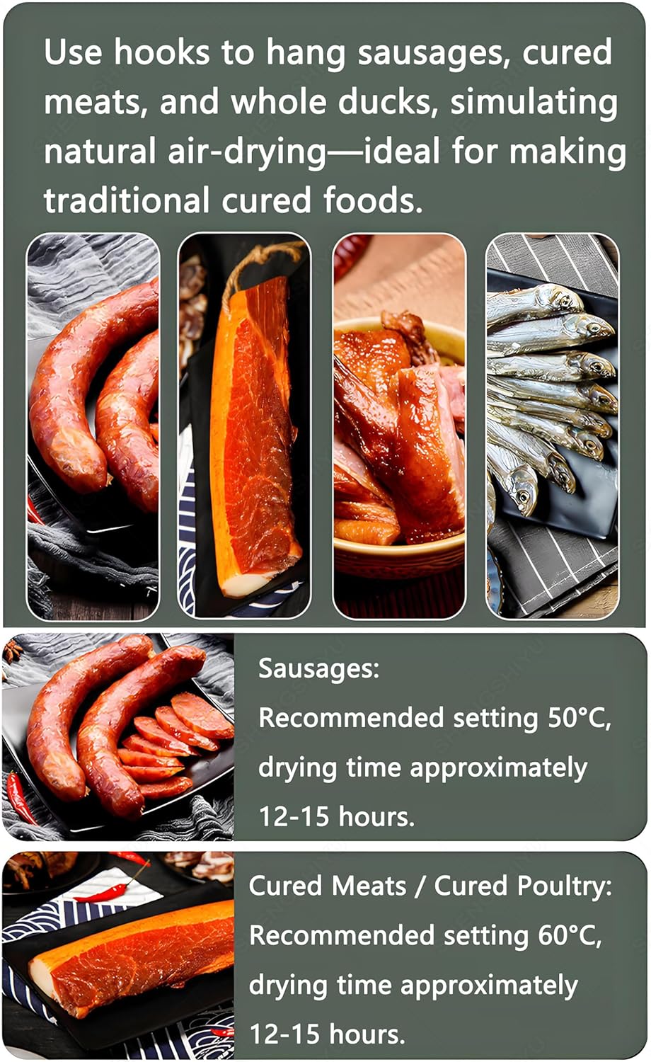 • 【Hanging Drying Design】Specially designed for Chinese sausage, cured meat, cured duck, cured fish and other preserved foods. Whole chicken and whole duck can be hung for thorough drying.