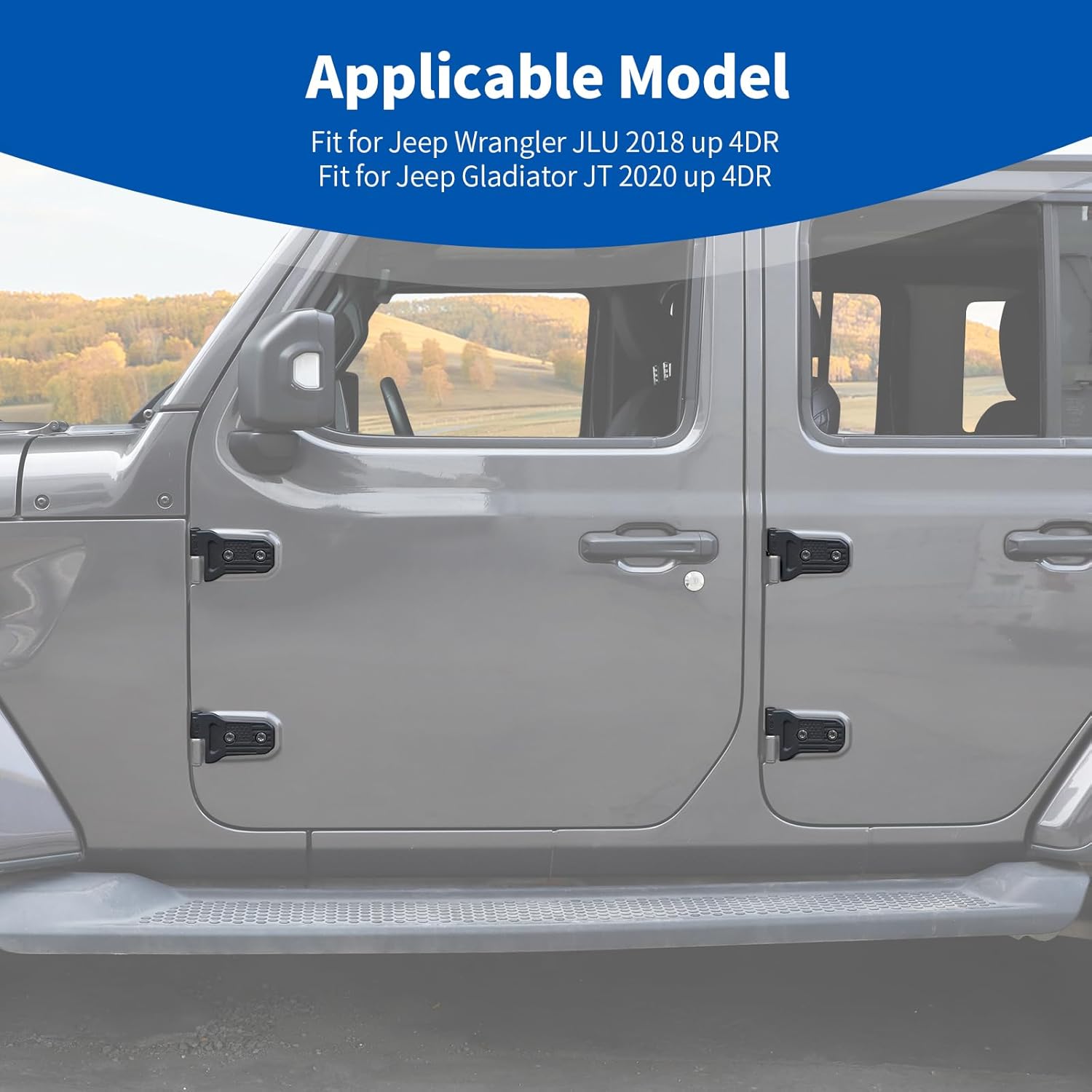 Product Specification: Fitment: Compatible with Jeep Wrangler JL JLU/Gladiator JT 2018 2019 2020 2021 2022 2023 2024 2025-Present Material: Aluminum Color: Black Powder Coated Finish Package Includes: 8PC - 4 Door Hinges with Installation Hardware Pattern: Flag Features: Durable Metal JL Door Hinge Solid Structure with Great Strength and Stability Textured finish and Coating on metal with good quality, Never rust, fade or peel Quick & Easy Installation After loosening the original bolts, remove the original hinges Replace with a new hinge and fix it with bolts and washers Complete the installation without removing the door