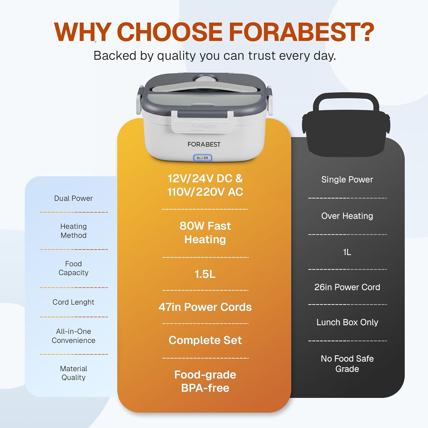 | Included Components | Container 0.45L, Electric 80W Lunch Box, Insulated Carry Bag, Leakproof Lid, One 1.5L Capacity Food-Grade Stainless Steel Tray and Utensils, Two 47" UL Cords |