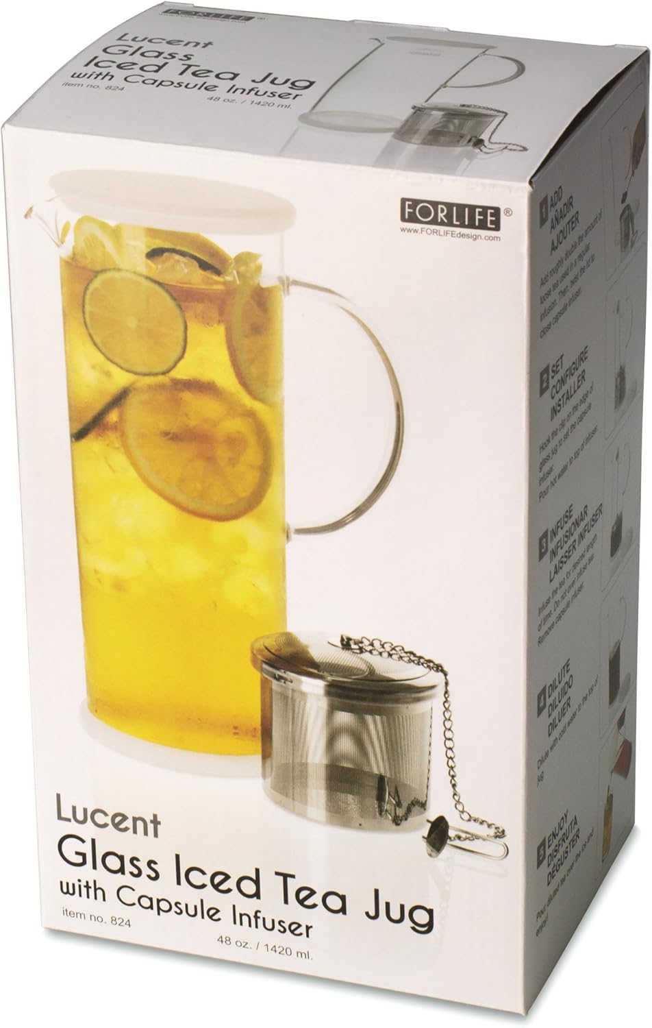 A quick recharge of tea to quench your thirst! Make delicious iced tea quickly with the Lucent Glass Iced Tea Jug. Experience pure tea flavor by brewing a tea concentrate and diluting with cold water. The jug, made from lead-free, heat resistant borosilicate glass, is easy to clean by hand due to its cylindrical shape. The infuser is made from durable stainless steel.