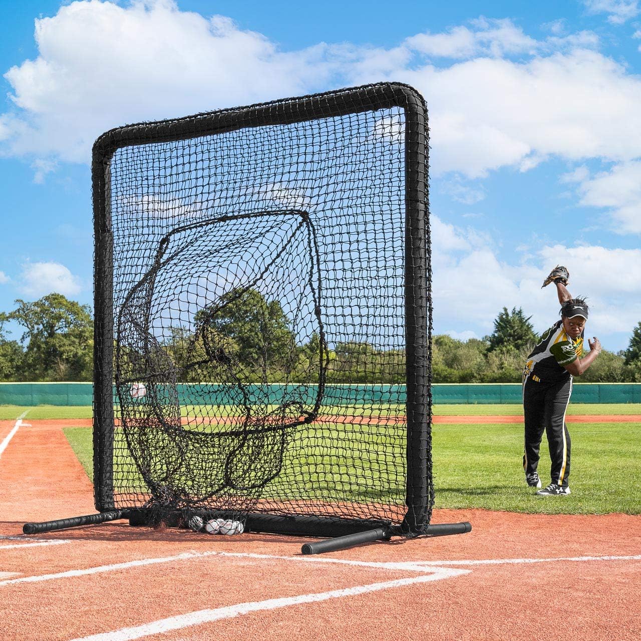 FORTRESS Pro Baseball Sock Net Screen [Nimitz Edition] SpecificationsDimensions:Height: 7ft (2.13m)Width: 7ft (2.13m)Materials:Net: UV stabilized #62 grade, 100% rot-proof poly twineFrame: Powder-coated 2in (50mm) steel tubingFoam covers: 1in thick foam protects from ricochetsMiscellaneous:Double bolts on all corners for super-strong jointsPillowcase design for quick and easy assemblyCatching sock in the middle collects baseballsLarge steel feet for firm stabilityAvailable with wheels