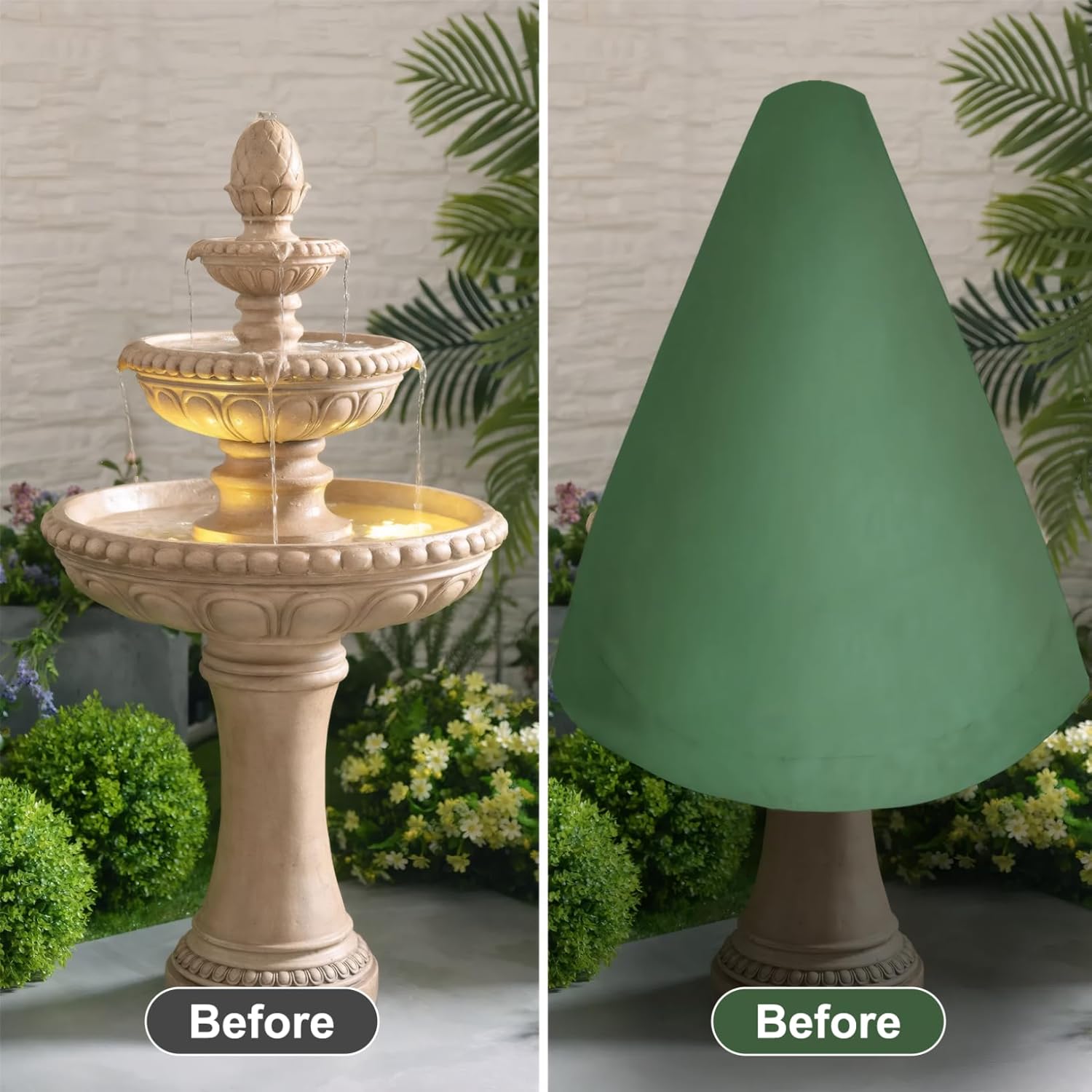 Description: Protect your outdoor fountains and garden statues with our Fountain Cover! Measuring 48 x 61 inches, this cover is crafted from stable, waterproof materials that shield your garden accents from harsh winter weather, including rain, snow, and ice. Its unique tree shape design adds an appealing aesthetic touch to your garden when not in use. Featuring an elastic hem and a locking drawcord, it provides a secure fit to it from being blown away during windy conditions. Keep your outdoor investments safe and looking great through the seasons with our reliable all-weather Fountain Coveryour ideal protective garden accessory! Features:. Fountain Cover. -Color: Dark Green. -Material: 600D Waterproof Oxford Cloth. -Size: about 48 x 61inch. Note: Manual measurement, please allow slight errors in size. The colors may exist slight difference due to different screens. Package Including 1 x Fountain Cover
