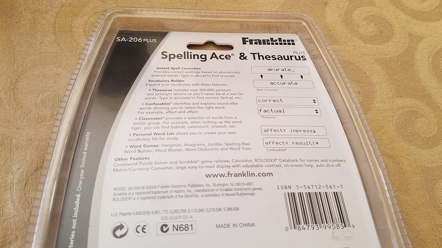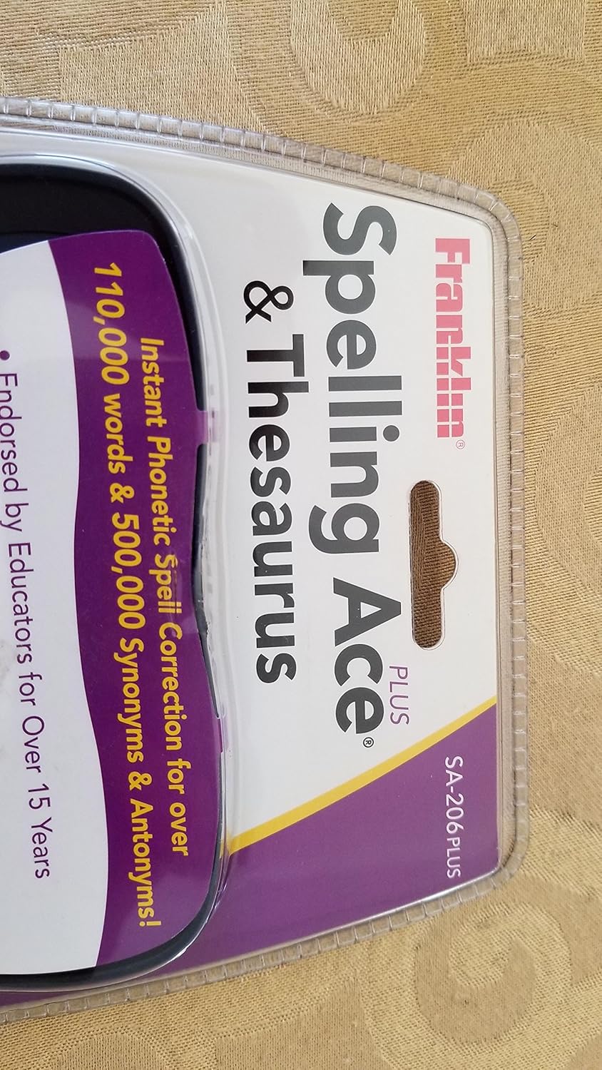 Product description Do you need it spelled out? The Franklin Spelling Ace can do it for you with 100,000 words and 500,000 synonyms and antonyms. The dictionary features phonetic spell correction, a crossword puzzle tool and a user list. Includes 8 word games, context-sensitive help text, a scrolling LCD screen with contrast control, automatic shutoff and volume control. Amazon.com Sharpen your spelling skills and refine your literary chops with the Franklin SA-206 Spelling Ace, which combines a portable English-language spelling corrector with a comprehensive thesaurus. The Spelling Ace offers phonetic spell correction for more than 100,000 words, along with more than 500,000 synonyms, antonyms, and "Classmates" (words from a similar category). As a result, it's easy to find the right word at the right time--a must for students, writers, educators, and more. Plus, the Spelling Ace makes learning fun, with eight word games to keep you sharp. The games range from traditional favorites like Anagram, Hangman, Jumble, and Spelling Bee to guessing games like Word Blaster. Though the Spelling Ace is primarily a spelling corrector and thesaurus, it also includes built-in calculator and a phone list databank that stores up to 100 names and numbers. Other features include a 16-character scrolling display, an adjustable contrast, a context-sensitive help mode for beginning users, and an auto-shutoff function that preserves battery power. The Spelling Ace measures a compact 5.25 by 3.5 by 1 inch (W x H x D) and requires four AAA batteries (not included). It's also backed by a one-year warranty on parts and labor. What's in the Box Spelling Ace, user's manual.