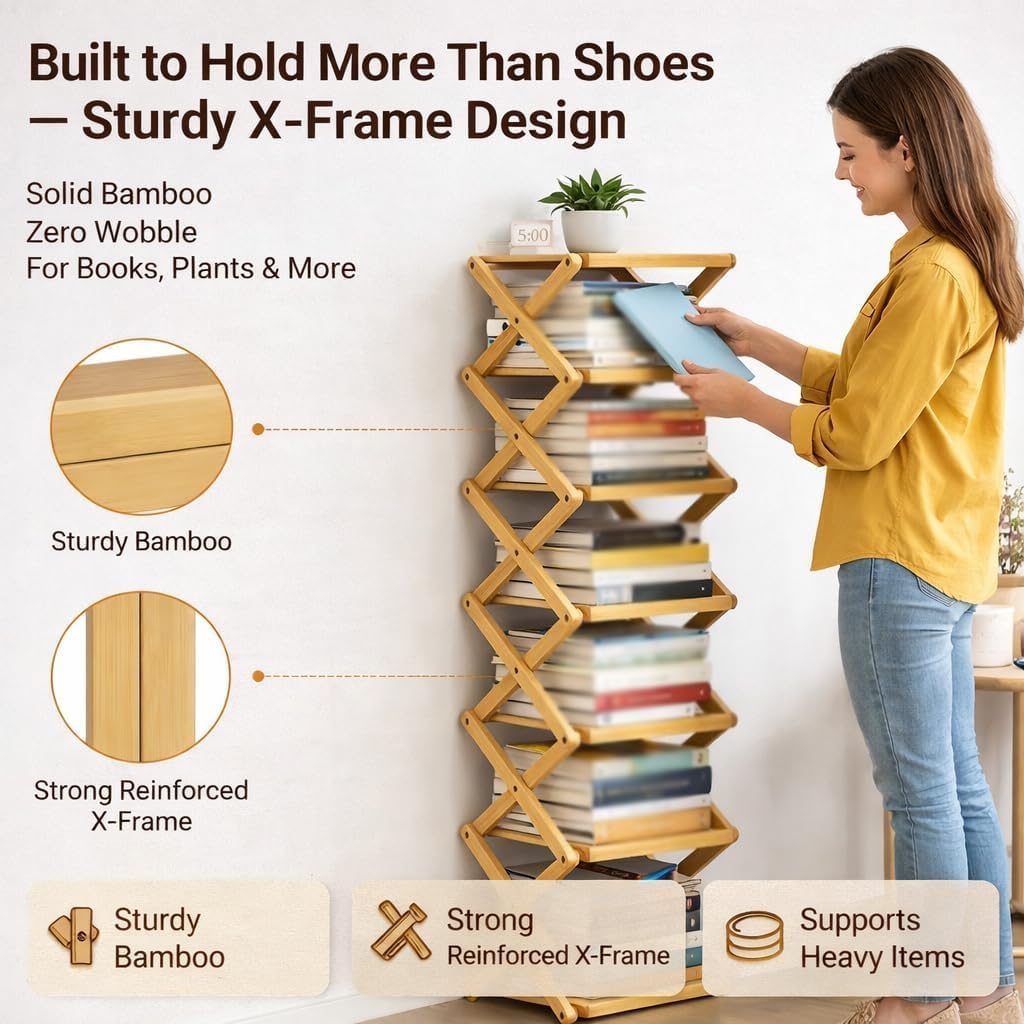 Shoe Rack, Foldable Bamboo Shoes Shelf, No Assembly Narrow Shoe Shelf Bamboo Shoe Rack,Foldable Space-Saving Organizer for Shoes, for Entryway Closet Dorm,Freestanding Shoe Storage Organiser for Entryway, Hallway, Bedroom, Closet Specifications:Name: Free installation folding shoe rackMaterial: BambooSize: 2 Tier-20CM/7.67IN,3Tier-37CM/14.5IN,4Tier-54.5CM/21.45IN,5Tier-72CM/28.3IN,6Tier-89.5CM/35.2IN,7Tier-107CM/42IN,8 Tier-124.5CM/49IN,9Tier-142CM/55.9IN,10Tier-159CM/62.59INPackaging size: 31X26.5X23.5CM/12.2X10.4X9.25INSpecial Feature:Foldable, Space SavingStyle:Rustic or ContemporaryApplicable shoe types: sports shoes, high heels, home decor itemsPackage Includes:1 PCS * Folding Shoe Storage Rack*1Note:1. Due to manual measurement, there may be a 1-3cm error, please understand.2. Actual color may be slightly different from the picture due to different monitors and lighting effects.3. If you have any questions, please contact me via email and we will reply within 24 hours. Welcome to our store.