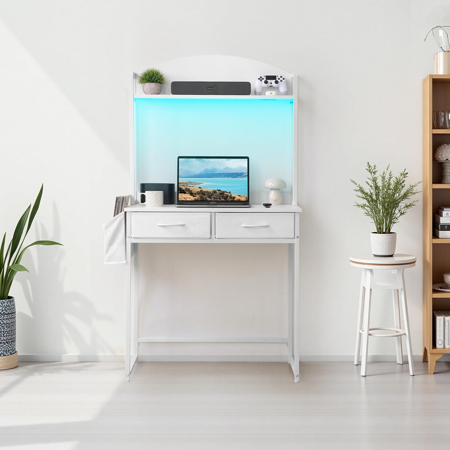 Freestanding Ladder Desk with Power Outlets, Small Home Office Study Reading Desk with 2 Fabric Drawers and Side Bag, 2 Tier Shelf Computer Gaming Desk, Modern Vanity Dressing Makeup Desk, Small