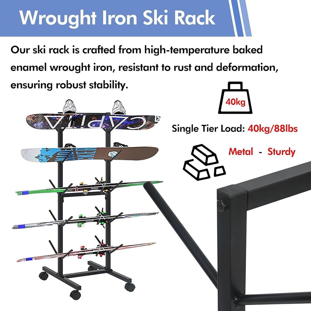 The MegLob freestanding snowboard storage rack's multi-functional design makes it ideal for storing snowboards in garages, basements, or ski resorts.Product SpecificationsMaterial: Metal IronLength: 37 cm (14 1/2 inches)Width: 55.5 cm (21 4/5 inches)Height:4 Tiers: 96 cm (37 4/5 inches)5 Tiers: 110 cm (43 3/10 inches)6 Tiers: 130 cm (51 1/5 inches)7 Tiers: 150 cm (59 inches)Color: Black, Gold, WhiteNumber of Tiers: 4 Tiers, 5 Tiers, 6 Tiers, 7 TiersWeight Capacity: 40 kg/88 lbs per tierPackage Contents:Snowboard Storage Rack * 1