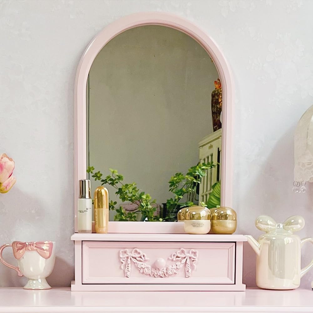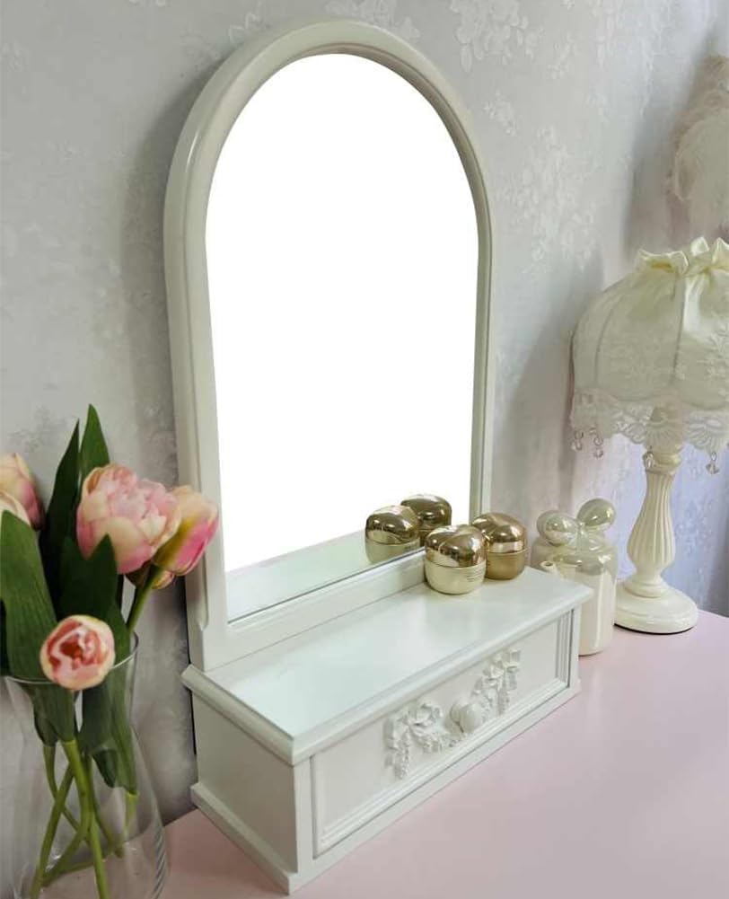 BOOMLATU French Style Solid Wooden Vanity Makeup Mirror for Desk with Bow-Carved Drawer,Stand-Aesthetic Table top for Bedroom,Living Room and Minimal Spaces Room Decor This dreamy romacntic vanity countertop mirror brings exquisite to your desk, dressing table, bathroom, well decorative your room, making your room looks elegant. Product Specification: Brand: BOOMLATU Package Contains: 1Piece x Decorative tabletop mirror Make-up: Solid wood + Glass +Resin Size: Mirror Height:25.5 inch(65cm); Base Length: 15.7 inch(40cm) Color: White,Pink Return Policy: Free exchange for wrong item shipped or damaged. For not-liked-style or not-fit-size reason, customer's responsibility to return the items to our facility in US Note: Due to manual measurement, please kindly allow 1-2cm discrepancy Please be reminded that due to lighting effects and monitor's brightness/contrast settings etc.The color tone of the website's photo and the actual item could be slightly different Thanks for your understanding!