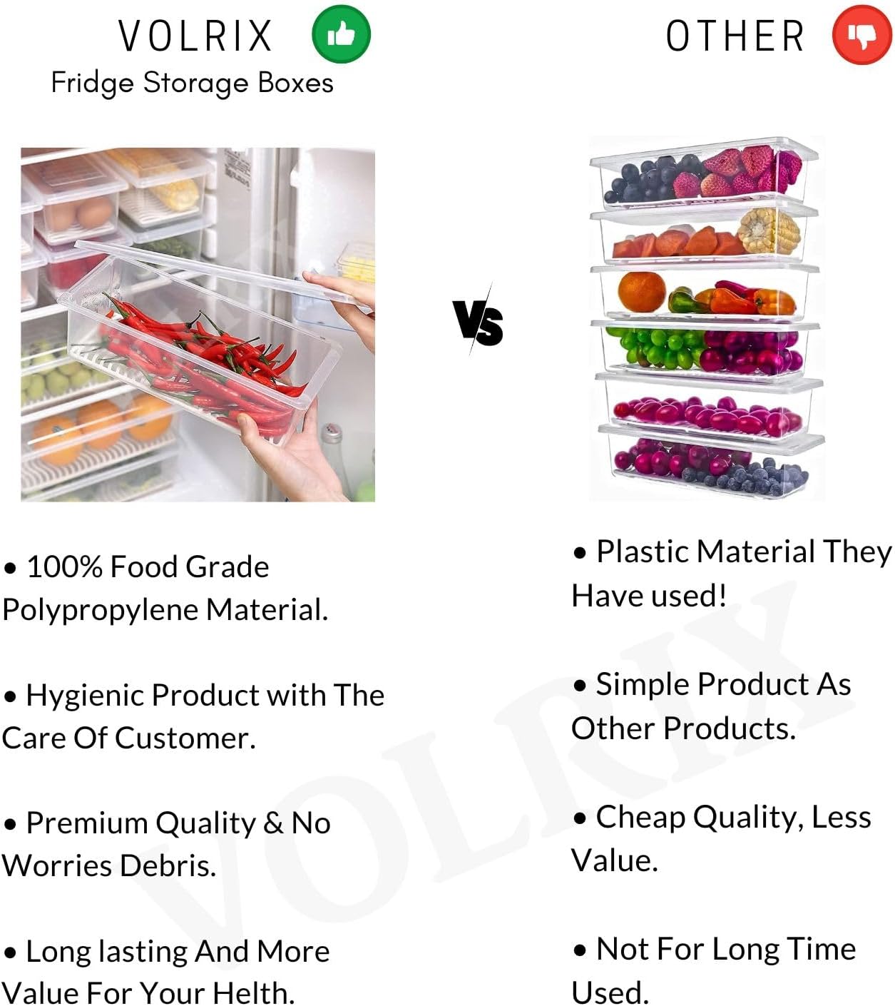VOLRIX Pack of 4 Fridge Storage Boxes Fridge Organizer with Removable Drain Plate and Lid Stackable Fridge Storage Containers Made of 100% food grade PP material. With a removable cover, smooth edges and surfaces will not hurt your hands. Dishwasher safe/stackable/refrigerator safe.The fridge organizers with detachable drain plate can prevent fruits, vegetables and meat from being immersed in water. The design of the fridge containers can save a lot of space in refrigerators, freezers, cabinets and drawers. They help organize the refrigerator and keep things tidy.Perfect design and high quality. Very good tool, perfect storage and freshness. Easy to use and clean.Clear freezer container, easy to find your food. Add the lid, prevent odors and keep your food dry and original.DURABLE AND EFFECTIVE SEALING: These fridge containers for storage are made of high food grade plastic which is highly durable. Refrigerated storage, effective sealing, prevent the interaction of different food odors, facilitate the management of food and save space WITH REMOVABLE DRAIN LID AT BOTTOM: Freezer storage containers comes with a drain lid below which drains the moisture from the food which helps in keeping the fruits & vegetables fresh all over the long durations; this fridge storage box is a blessing for urban modern smaller kitchens or where there are space constraints. DRAINAGE PLATE DESIGN: The bottom of the drainage plate is raised to reduce food contact with the bottom, so as to avoid food damage caused by dampness. STACKABLE TO SAVE SPACE: The refrigerator storage containers design allows for excellent space savings in the refrigerator, freezer, cupboard and drawers. They help organize the fridge and keep things clean and tidy. MULTIPURPOSE: Fo