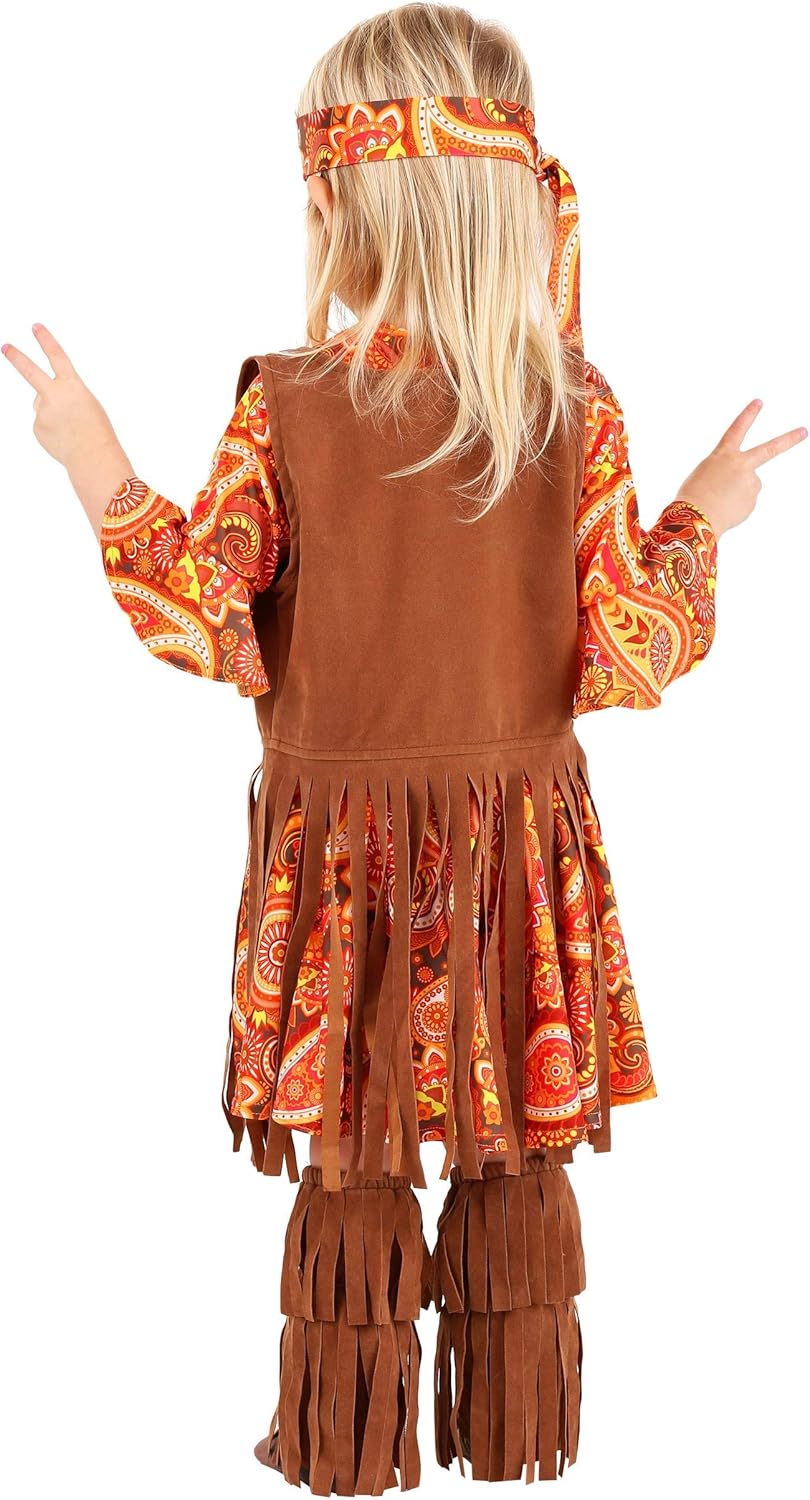 The only thing more groovy than a hippie is a toddler wearing this Fringe Hippie Costume. This dress has a scoop neck, long bell sleeves, an all-over paisley print, and fastens in the back with a hook and loop fastener. Also included is a faux suede vest with long fringe, faux suede boot covers with fringe, and a headband that can be tied as desired. - Dress - Vest - Headband - Pair of Boot Covers