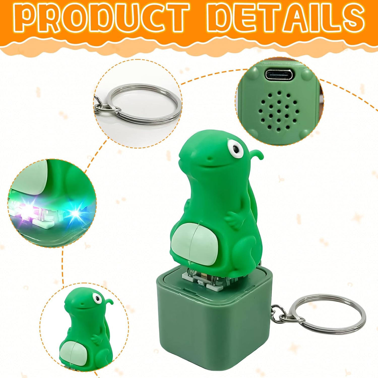 Specifications: Product Name: Key Ring with Sound Button Material: PVC Size: as shown in the picture. Weight: 30g Power supply: USB charging Package included:1 x Key Ring with Sound Button