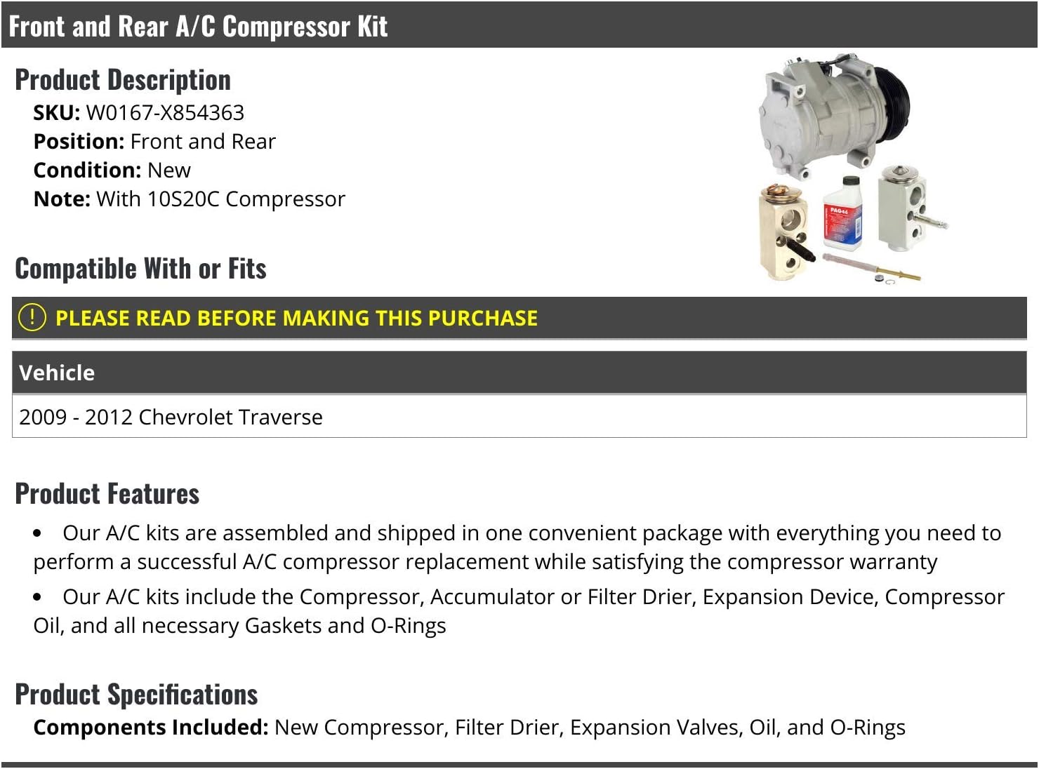 Front and Rear A/C Compressor Kit - with 10S20C Compressor, Filter Drier, Expansion Valves, Oil, and O-Rings - Compatible with 2009 - 2012 Chevy TraversePosition: Front and RearNote: With 10S20C CompressorComponents Included: New Compressor, Filter Drier, Expansion Valves, Oil, and O-RingsFeatures: - Our A/C kits are assembled and shipped in one convenient package with everything you need to perform a successful A/C compressor replacement while satisfying the compressor warranty - Our A/C kits include the Compressor, Accumulator or Filter Drier, Expansion Device, Compressor Oil, and all necessary Gaskets and O-RingsCompatible With or Fits: - 2009 - 2012 Chevy Traverse