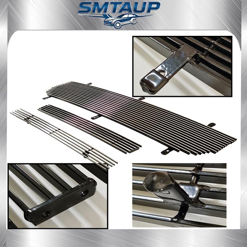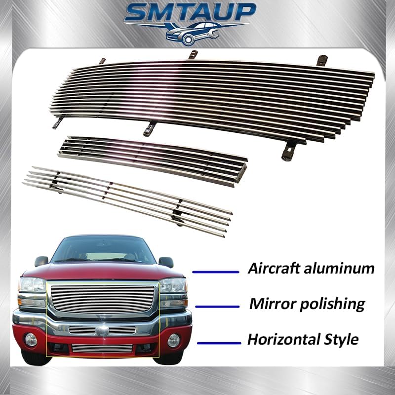 Features FITMENT: *2003-2006 GMC Sierra 1500/Sierra 1500 HD/Sierra 2500 HD/Sierra 3500*2007 GMC Sierra 1500/Sierra 2500 HD/Sierra 3500 Classic Model*2003-2004 GMC Sierra 2500 AIR CRAFT GRADE:Air craft grade 6061-T6 aluminum solid billet grille inserts can protect the front end of yourvehicle. Each grille guarantees a shiny polished surface with black satin powder coating on the back. BAR WIDTH: 3.5mm ~ 4.0mm (1/8in ~5/32in) APPEARANCE:Corrosion resistant aluminum billet grilles in polished mirror finish chrome color. PACKING:Grille insertonly,Hardware and instruction are included.But logo or emblem or shell is NOT included.Item Specifications Materials : Aluminum Style :Horizontal Billet Position : Main Upper+Lower Bumper Pieces :3 pcs Installation:Replacement (Cutting Required) Special note :Grille insert only, logo or emblem, frame orshell is NOT included.Return Policy We accept return or exchange within 30 daysafter package delivered. Products must be in thecondition you received them and in the original box and/orpackaging.