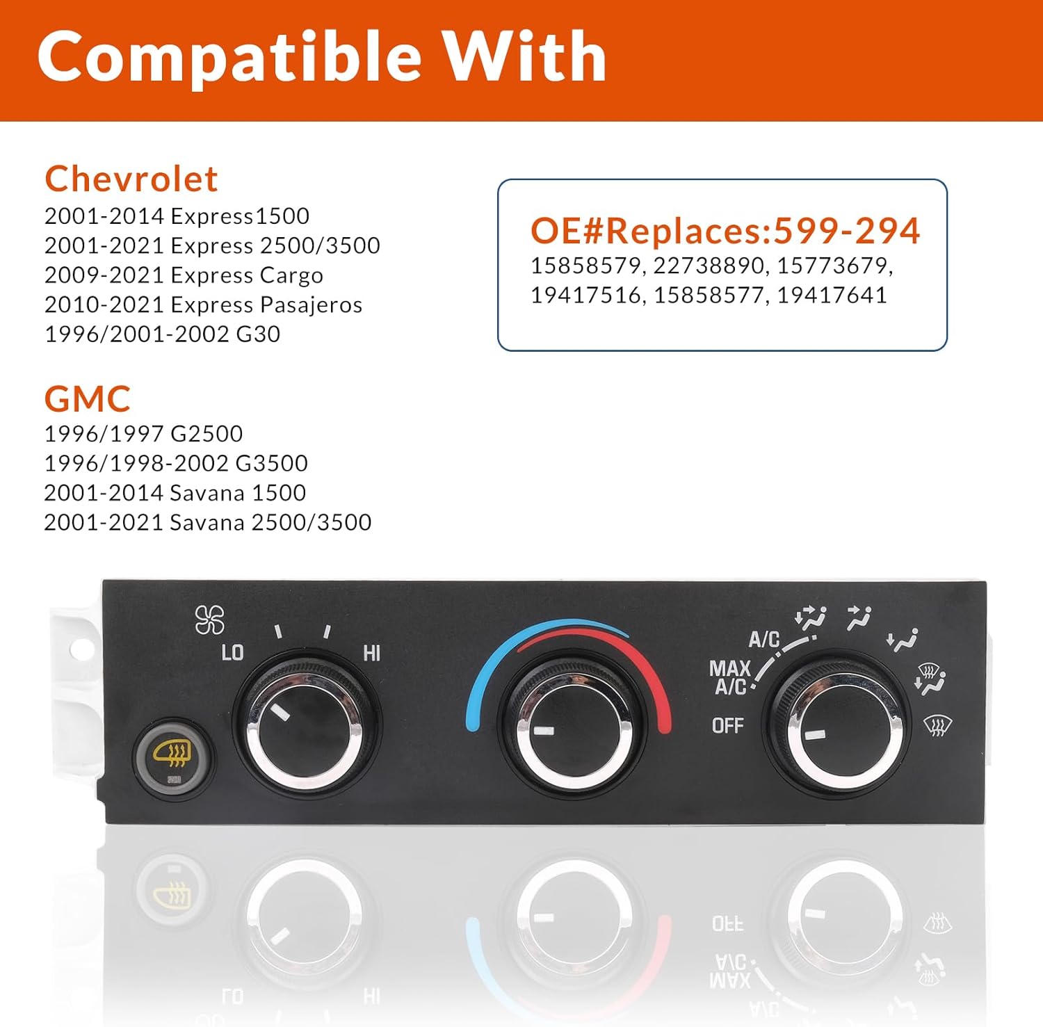 Perfect Fit Guarantee: Direct replacement for:Chevrolet: Express 1500 (2008-2014), Express 2500/3500 (2008-2022), Express 4500 (2009-2019), Express Cargo/Pasajeros (2009-2023)GMC: Savana 1500 (2008-2014), Savana 2500/3500 (2008-2022), Savana 4500 (2009-2019)Matches OEM Part # 15773679. Always verify your model year and original part number.Stable & Precise Control: Integrated knobs and buttons for accurate adjustment of temperature, fan speed, and airflow direction, enhancing cabin comfort.Durable Construction: High-quality, wear-resistant ABS/PP plastic. IP68 rated (superior dust/waterproofing), resistant to corrosion and high temperatures. Features durable metal connectors.Simple Installation: Plug-and-play direct replacement; no programming needed. Professional installation recommended if unfamiliar.Intuitive Controls:Temp Knob: Turn to Red for heat; Blue for cooling.Fan Knob/Button: Controls airflow volume.Airflow Buttons: Select vent direction (Windshield/Defrost, Floor, Face, or combos).A/C Button: Press ON for cooling (activates compressor). Not needed for heat (uses engine).Recirc Button: Circulates cabin air. Improves cooling efficiency/fuel economy; blocks outside fumes (e.g., traffic). Avoid prolonged use.The Benefit: Essential for maintaining a comfortable cabin environment. Optimal temperature and air quality contribute directly to driver alertness and road safety.