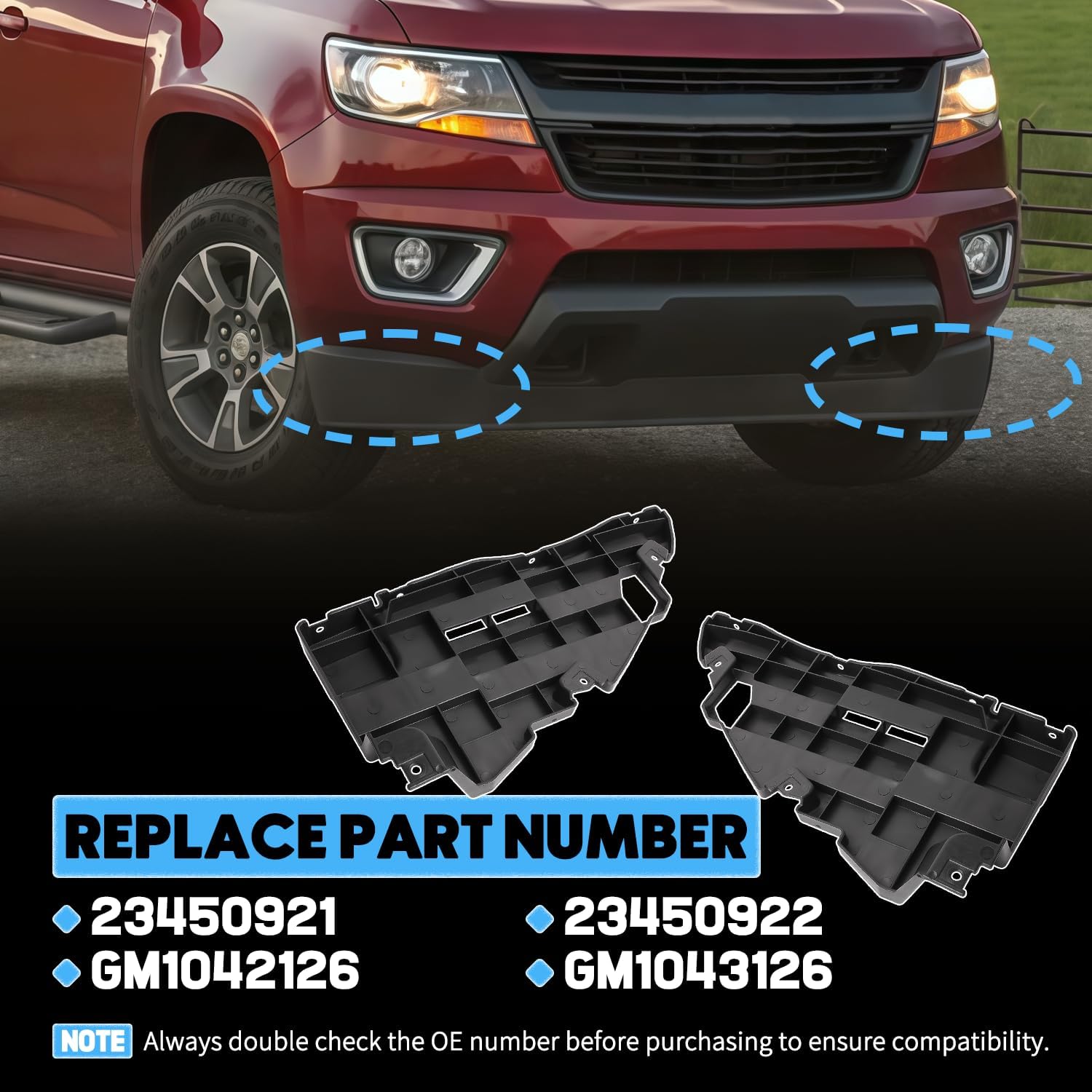Part Name: Bumper Cover SupportBrand: PasanguiLocation: Front Left SIde And Front Right SideReplace Part Number: 23450921 23450922 GM1042126 GM1043126Product Material: PlasticColor: BlackWarranty: 1 YearInclude Packing:1 × Bumper Cover Support (Left Side)1 × Bumper Cover Support (Right Side)Fitment: Fit For GMC Canyon 2015Fit For GMC Canyon 2016Fit For GMC Canyon 2017Fit For GMC Canyon 2018Fit For GMC Canyon 2019Fit For GMC Canyon 2020Fit For Chevy Colorado 2015Fit For Chevy Colorado 2016Fit For Chevy Colorado 2017Fit For Chevy Colorado 2018Fit For Chevy Colorado 2019Fit For Chevy Colorado 2020Advantage:Reliable Construction:Engineered to handle everyday wear and tear, this bumper trim delivers consistent performance under different road and weather conditions, supporting long-term durabilityProtection from Debris and Moisture:Seals off areas vulnerable to dirt, water, and debris to help reduce corrosion and keep internal bumper components clean and protectedImproved Structural Alignment:Maintains proper alignment between bumper parts, minimizing visible gaps and ensuring a smooth, cohesive front-end fit for better stability and appearanceReinforced Plastic Strength:Crafted from high-quality plastic that provides internal structural support, it holds its form under pressure and temperature changes for dependable, long-lasting performanceHeat and Corrosion Resistance:Resists heat, cold, and moisture exposure to prevent deformation or wear, helping extend the lifespan of bumper componentsStable Fit and Long-Term Support:Designed to integrate securely within the bumper assembly, offering structural reinforcement that supports consistent shape and alignment over time