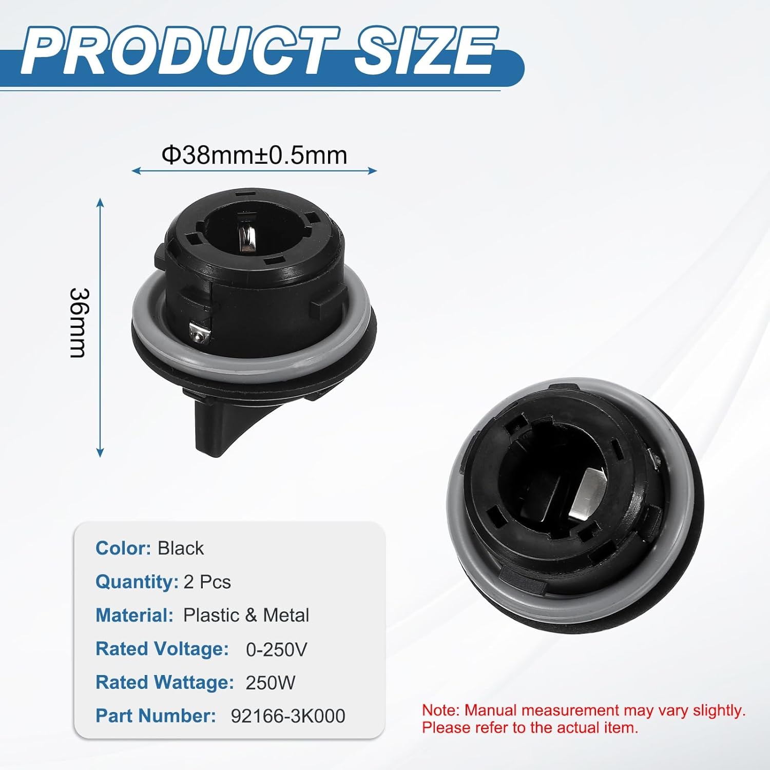 Multiple Use: This front turn signal lamp socket replaces OEM part number 92166-3K000. It fits for:Kia models, including Soul 2012-2019, Sportage 2010-2022, Sorento 2015-2020, Forte 2009-2013Hyundai Sonata 2011-2015, Veloster 2012-2017, and Elantra 2007-2010. Check compatibility before ordering.What You Can Get: 2 Pcs Black headlight turn lamp holders. Each assembly is a direct replacement for worn or broken sockets. If your signal light is dim, flickering, or not working due to a bad holder, this set gives you everything needed to fix the issue quickly. Size: L36×D38mm±0.5mm.Material & Design: Built from good quality plastic and metal with brass conductors for better electrical flow. The ABS housing resists heat and prevents melting. A silicone O-ring creates a tight seal that keeps moisture out, stopping fog and protecting the connection from water damage over time.Easy to Use: Simple plug-and-play installation—just remove the old socket from the bulb and wiring, then plug in the new one. No special tools or professional help needed. Get your lights working again in minutes and save time on a mechanic check.Wide Application: Perfect for DIY car repairs at home. Use these 921663K000 lamp holders to restore front turn signals, parking lights, or corner lights on compatible Kia and Hyundai vehicles. Great for fixing aging sockets that have burned out from years of use.