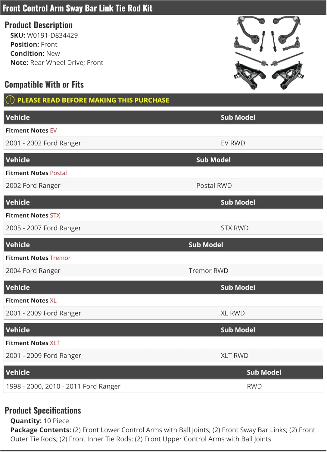 Front Upper and Lower Control Arm Ball Joint Sway Bar Link and Tie Rod End Kit - 10 Piece - Compatible with 1998 - 2011 Ford Ranger RWDPosition: FrontNote: Rear Wheel Drive Models OnlyQuantity: 10-PiecePackage Contents: (2) Front Lower Control Arms with Ball Joints; (2) Front Sway Bar Links; (2) Front Outer Tie Rods; (2) Front Inner Tie Rods; (2) Front Upper Control Arms with Ball JointsCompatible With or Fits: Note: EV - 2001 - 2002 Ford Ranger EV RWDNote: Postal - 2002 Ford Ranger Postal RWDNote: STX - 2005 - 2007 Ford Ranger STX RWDNote: Tremor - 2004 Ford Ranger Tremor RWDNote: XL - 2001 - 2009 Ford Ranger XL RWDNote: XLT - 2001 - 2009 Ford Ranger XLT RWDNote: - 1998 - 2000, 2010 - 2011 Ford Ranger RWD
