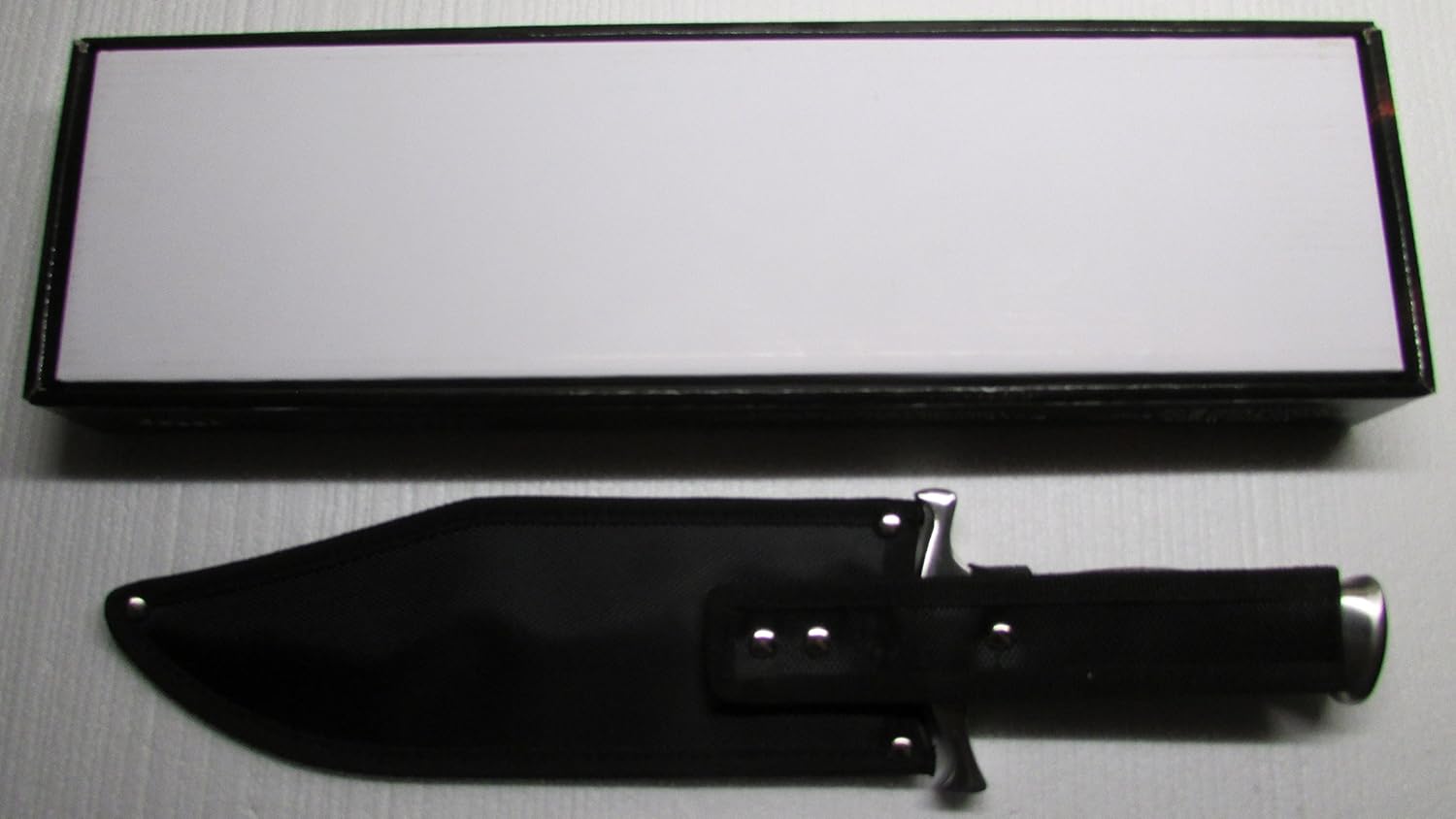 15" overall. 9.5" satin finish stainless clip point blade. Black finger grooved pakkawood handle. Stainless guard and pommel. Black nylon belt sheath. Boxed.
