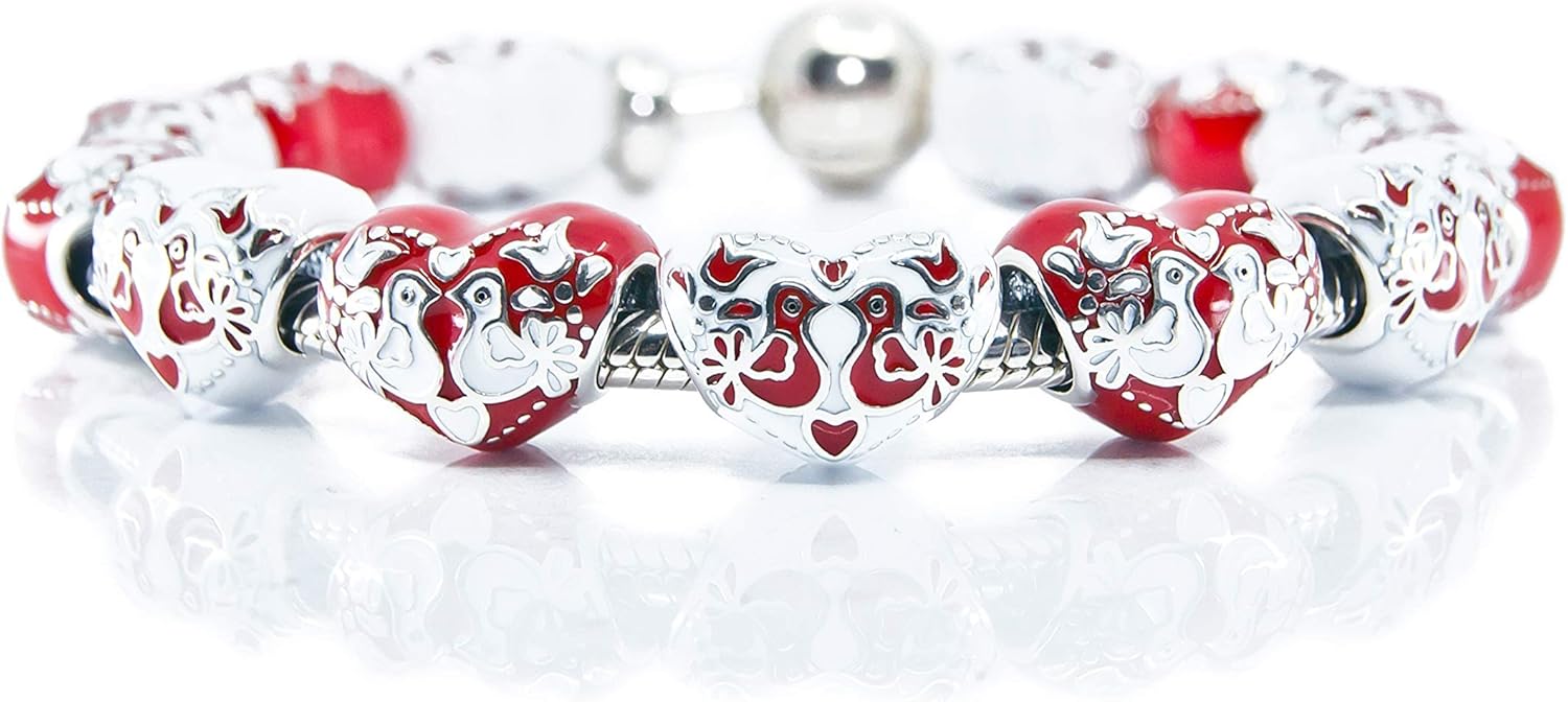 Frozen Lovebirds - Red & White Enamel Heart Sterling Silver Charm Bead Sterling Silver Aurora Charm from our exclusive Folk Art Inspired Enamel Collection. Original Aurora motif of two lovebirds kissing each other, surrounded by floral ornaments and hearts. Couple of birds in this position is a traditional love motif, inspired by folk art typical for German, Russian Hungarian, Slovak, Czech and Polish tradition. Red enamel birds on the white background can resemble lovers frozen in the kissing position for eternity.Perfect for a charm necklace, charm bracelet or as a bead for your neck chain. Charm is hand finished and made from top quality materials: solid sterling silver 925 and enamel. Item comes in Aurora Gift Pouch. All Aurora Charms are fully compatible with similar core size charm bracelets like Pandora, Chamilia, Ohm, Troll, etc. C A R E ∙ T I P S We don’t want your special moment to fade. To maintain the quality of your new Aurora Charm jewelry, please: - Do not wear it to the pool, spa, or the beach - Remove when sleeping, exercising, or doing other physically strenuous activities - Avoid contact with perfumes, body oils, and other chemicals, including household cleaners. - Do not use chemical jewelry cleaners - Gently polish with a soft, lint-free cloth. Please do not use a metal polishing cloth - Store your beloved jewelry in a cool dry place.
