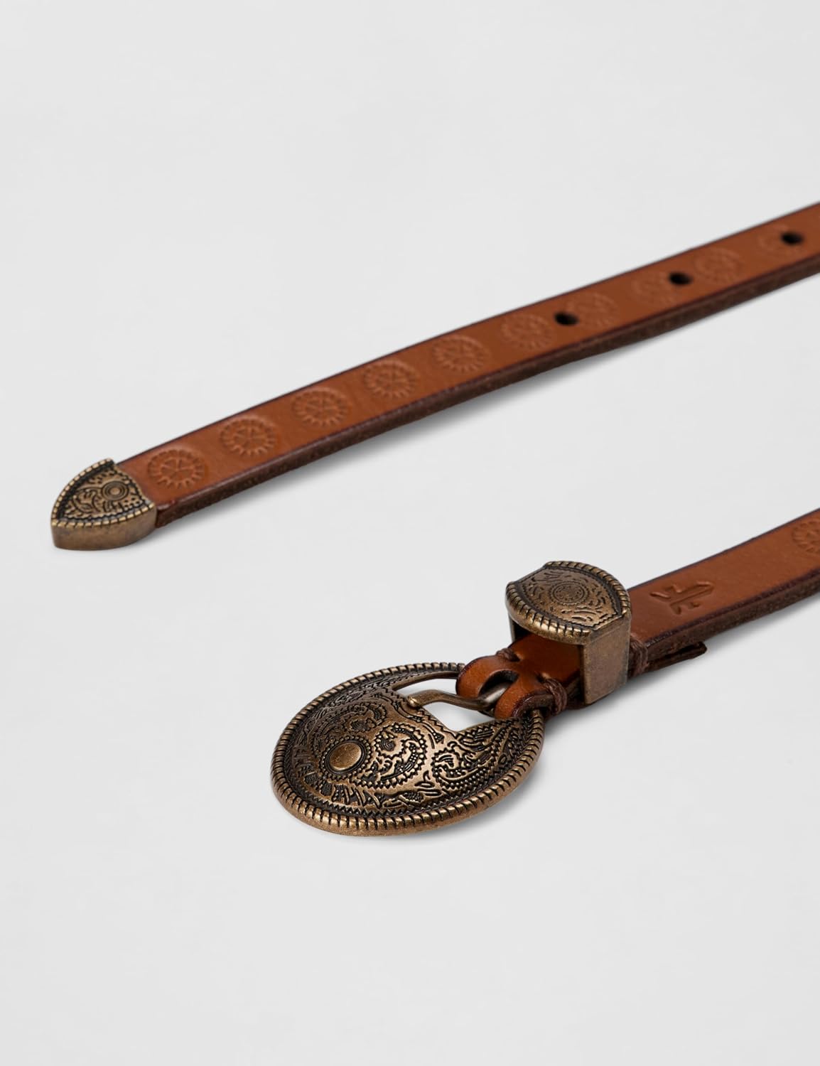 15MM Frye leather belt with tooling and western detailing. Smooth pull up leather belt. Antique brass hardware. Buckle closure. Imported.
