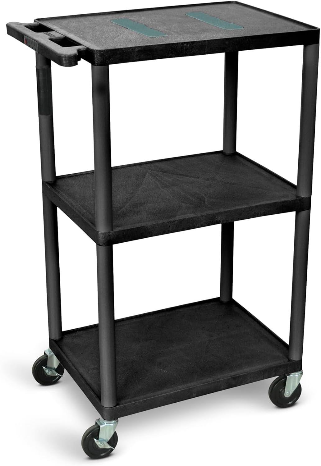 This 42" AV Cart is ideal for storing and transporting audio/video equipment and more. Three durable shelves are made from a molded plastic that will not stain scratch dent or rust and can hold up to 300 lbs. in total. The top shelf has an ergonomic handle molded into it for greater control during transit as well as a three-outlet UL-Listed electrical assembly with integrated cord wrap to provide convenient access to power. This rolling cart also