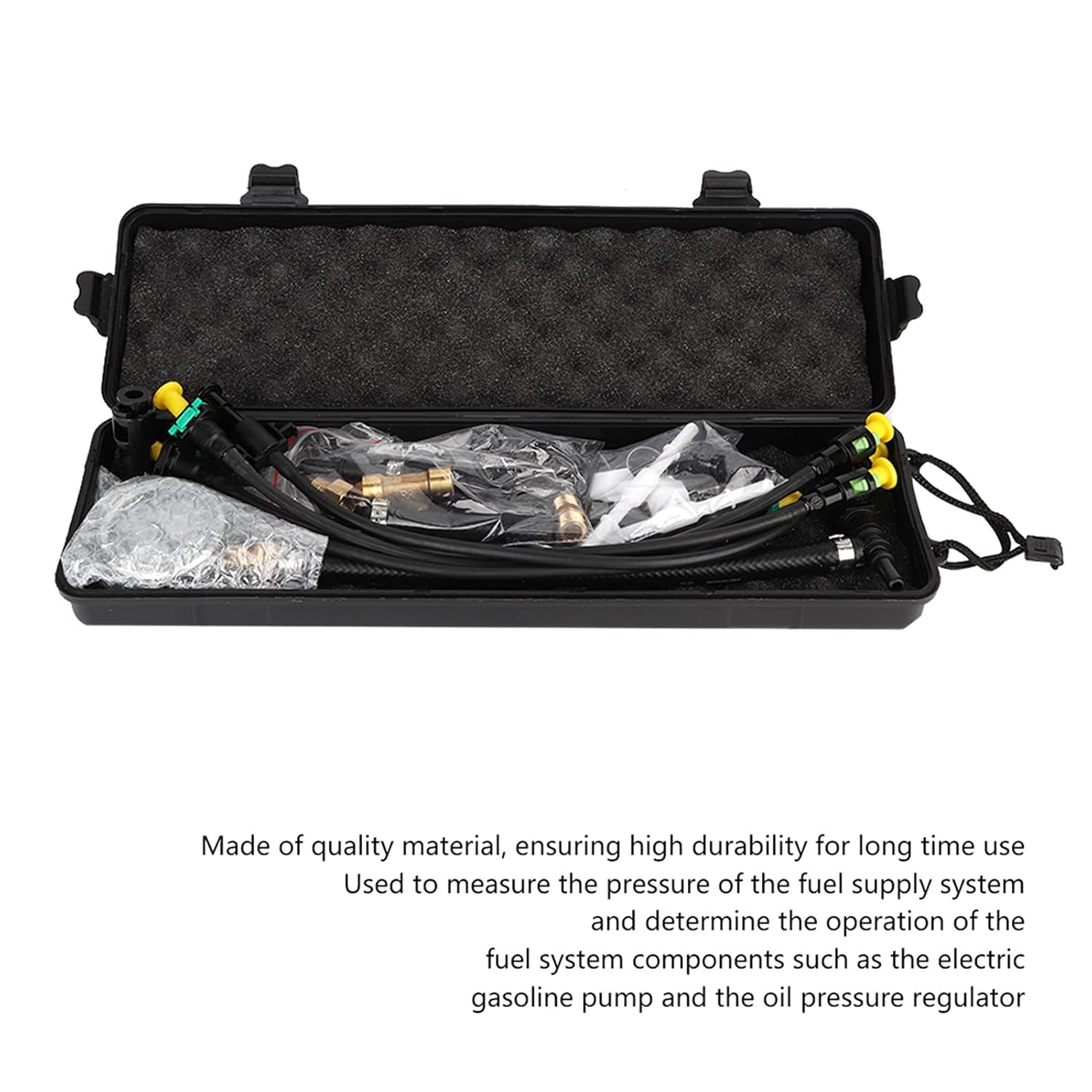 Features: Made of quality material, ensuring durability for time use. fuel pressure is used to measure pressure of fuel supply system and determine of fuel system components such as electric gasoline pump and oil pressure regulator. It can delivers vehicles' highest performance, with and highly . A proper fuel pressure is at throttle to lean conditions. It is a dedicated tool for inspecting and troubleshooting fuel system. Specification: Condition: 100% Brand New Material: ABS Color: As picture shown Connection : Install fuel pressure , disconnect fuel pressure common and oil pipeline connection, and connect fuel pressure tee in series for measurement. From measured values, it is to judge of fuel system components such as electric gasoline pumps and oil pressure regulators. Measurement: 1() After 5s automatic pumping of electric gasoline pump, observe fuel pressure on oil pressure . normal oil pressure is about 300KPa. If oil pressure is swung around 300KPa, oil pressure regulator works normally. After measuring end of initial oil pressure for 5 minutes, observe fuel system to maintain pressure indicated by oil pressure gaugeShould. not be lower than 147KPa. If oil pressure is too , check whether oil pressure regulation road is working properly; if oil pressure is too low, check electric gasoline pump to maintain pressure, oil pressure regulator to maintain pressure and injector to leak. 2() Measurement of fuel pressure during operationStart. and run at idle speed. Observe that fuel system pressure indicated by oil pressure should not be lower than 250KPa. Otherwise, check vacuum for leaks or wrong insertion. Press accelerator pedal and observe acceleration oil pressure indicated by oil pressure when throttle is fully openIt. should be no less than 300KPa. Otherwise, check vacuum tube for leaks or wrong insertion. 3() Fuel pressure measurement after unplugging oil pressure regulator vacuum tubeUnplug.