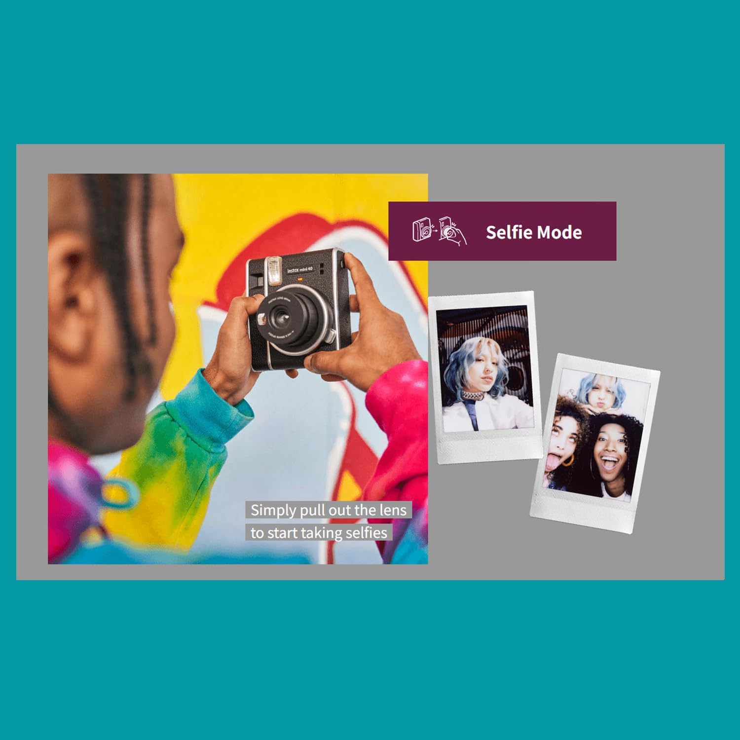 Make a statement with your style with the Instax Mini 40 instant camera. A sleek, fun, and stylish camera capable of producing instant credit card-sized prints. The Instax Mini 40 is pumped with attitude for today’s new generation of image-makers and shot-takers. Combining fast-to-action features with classic design cues and the use of Instax Mini instant film, it’ll keep you one shot ahead of the rest. The Instax Mini 40 is ready to hit the streets running thanks to its built-in selfie mode. Pull out the lens for an extra click, line yourself up in the mirror and capture your style in a one-of-a-kind selfie. With the power of automatic exposure, the camera automatically calculates the brightness of the environment you’re in, so what you see is what you get, every shot, and every time. All this is packaged up in a timeless and epic silhouette. It also features a unique design with premium silver accents and a deluxe black texture that is sensational to touch.