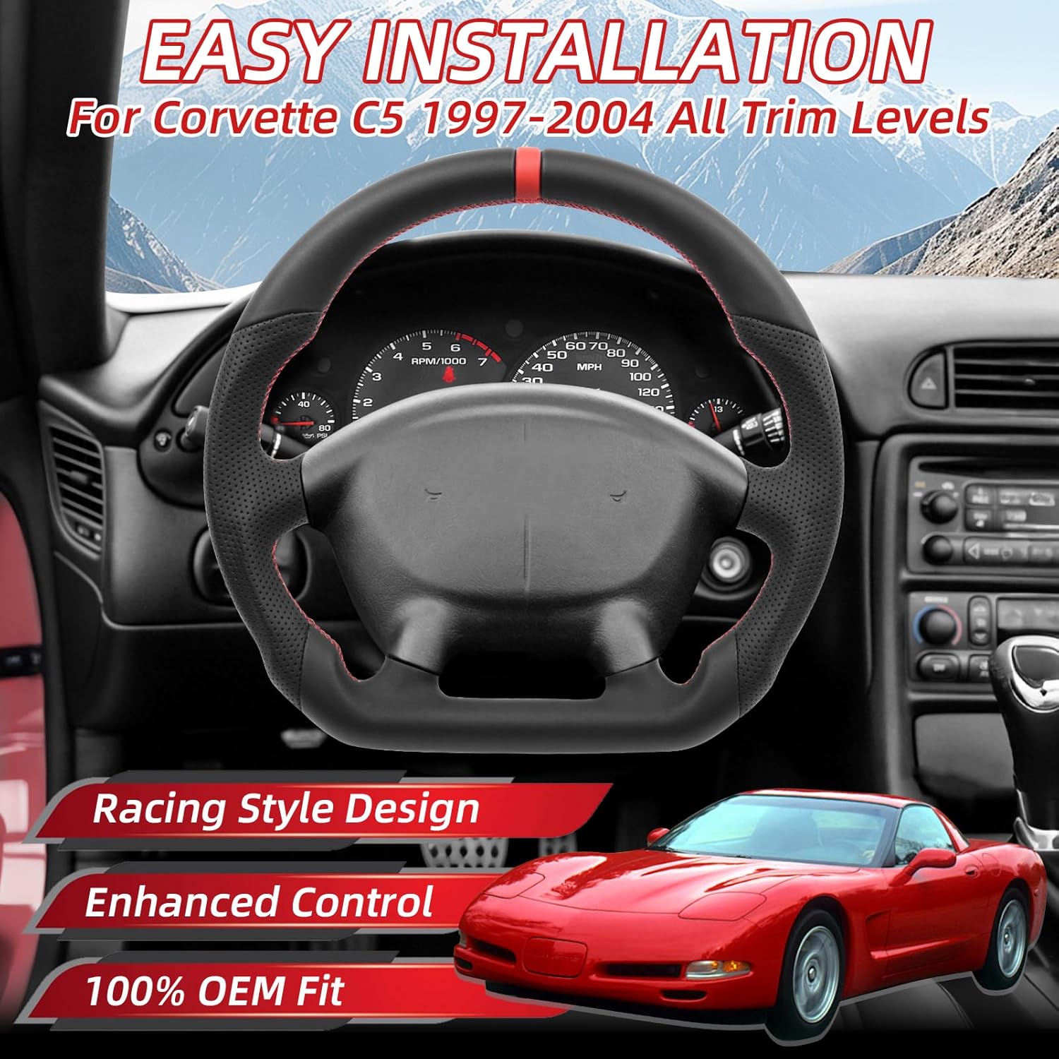 Full Black Leather Steering Wheel for Chevy Corvette C5 1997-2004 Base Z06 Convertible Coupe, Flat Bottom D-Shape, Black Stitching No Center Stripe, OEM Fitment Interior Restoration