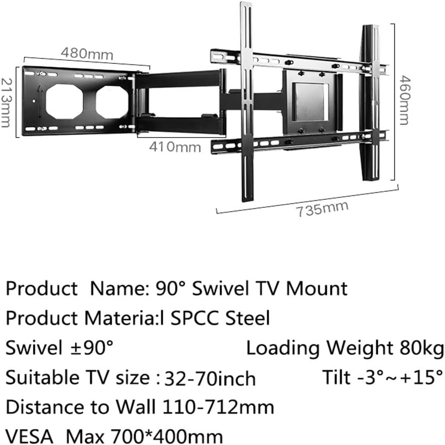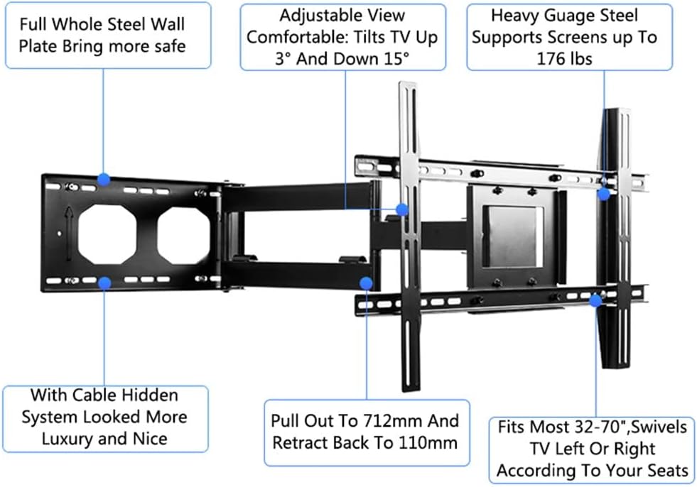 The wall plate cover and cable hidden system of tv mount looked more luxury and nice, also made the TV cable behind your TV neatly.With this full-motion tv mount, you can be easy to fix, tilt, extend, fold and rotate your TV and any viewing angle whatever you wanted. Advance technologies design make viewing angle easy and convenient. Our standard Accessories enable you to extend VESA tv mounting distance from 100*100mm to 700*400mm. The arm can extend to 710mm maximum.Material: SPCC cold rolling steel Suggested TV Size: 32"/37"/40"/42"/50"/55"/60"/65"/70" VESA: 100*100mm/ 200*100mm/ 200*200mm/ 300*200mm/300*300mm/ 400*200mm/400*300mm/ 400*400mm/600*400mm/700*400mm Max. Loading: 80kg Tilt: -3°~ +15° Swivel: -90°~ +90° Wall distance: 110mm~710mm Color: blackNote:Due to the different monitor and light effect, the actual color of the item might be slightly different from the color showed the pictures. Thank you!Please allow 1-2cm measuring deviation due to manual measurement.Quantity : 1 pcs