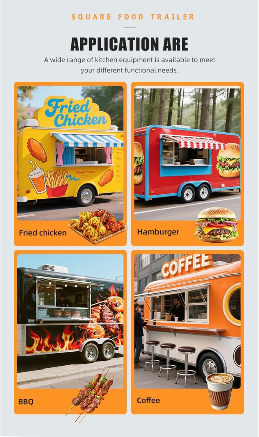 Product name:Food Trailer Material:Stainless Steel Type:Food Trailer Installation:easy assembly Wheel:4 wheel Frame Material:Aluminum Application:Food, Food Shop, Restaurant, Food & Beverage Shops, snack food, Commercial catering, Chips, HOTDOG, fast food, mobile food Number of shelves:customized Warranty:1 Year Cooking Equipment:Customized Machinery Capacity:Customized Recommended use:Outdoor Maintenance:Easy Cleaning Function:Snack Cart Color:Customized Color Shape:Square Food Trailer Equipment Optional:Customized Catering Equipment 1. Customized service: size, luminous characters, color; LOGO, etc. can be customized. 2. Send you a catalog of kitchen utensils, and the internal kitchen equipment can be selected according to your needs. 3. We can provide 3D drawings so that you can preview the interior of the customized food trailer. 4. Mobile food trailers can be used to sell cupcakes, salads, sandwiches, wraps, nachos, crepes, waffles, hot dogs, hamburgers, tacos, tiramisu, bread, pasta, pizza, pancakes, potato chips, baked sweet potatoes, fried chicken, bento, sushi, ice cream, ice cream rolls, cold drinks, juice, coffee, kebabs, barbecue, etc.