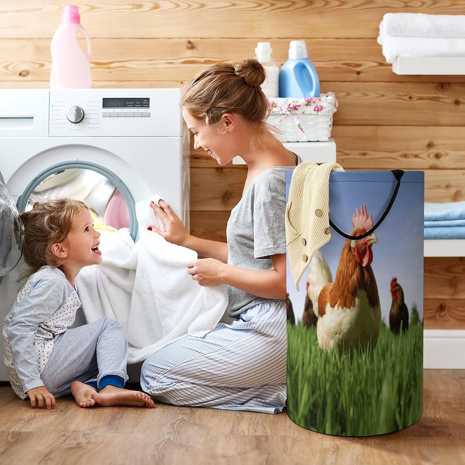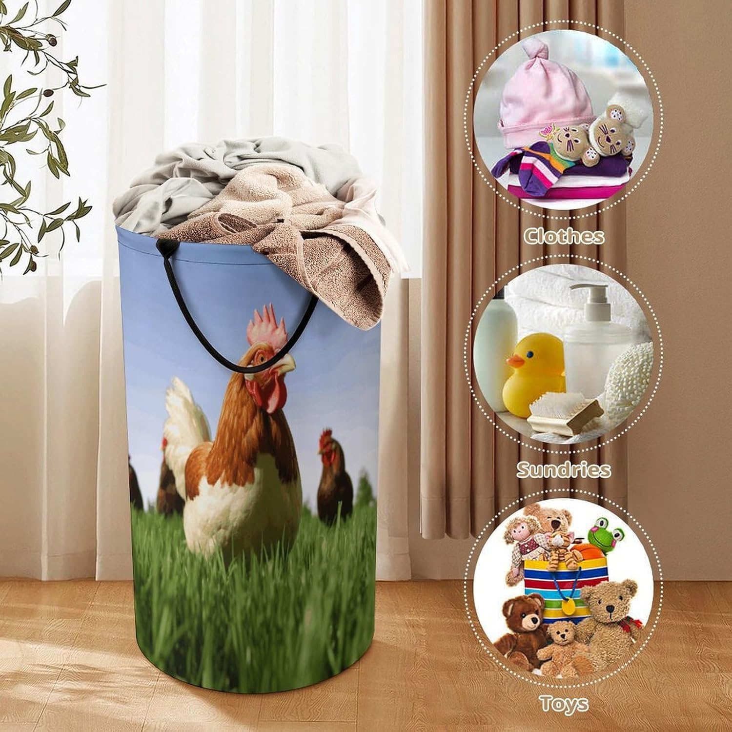 The pattern of the Funny Chicken Grass hamper is printed with exquisite patterns, which makes the product more attractive.Chic design allows it to be used in the living room to hold throw blanket, pillows, and reading materials, as well as in the bathroom for towels, or as a laundry hamper.The laundry hamper adopted collapsible design, equipped with handles. It is lightweight and portable for using, storing, and moving conveniently.Funny Chicken Grass Clothes hamper is suitable to store dirty clothes washing, place in the room to store toys, and other household goods, keep the house clean and tidy. Perfect laundry hamper for home, office, closet organizer, bedroom, bathroom, college dorm, etc.Gets out of your way when you need it to. This storage basket or laundry hamper is a good gift, which not only meets everyday storage needs but also carries deep care and love, a perfect way to turn thoughtfulness into warmth.
