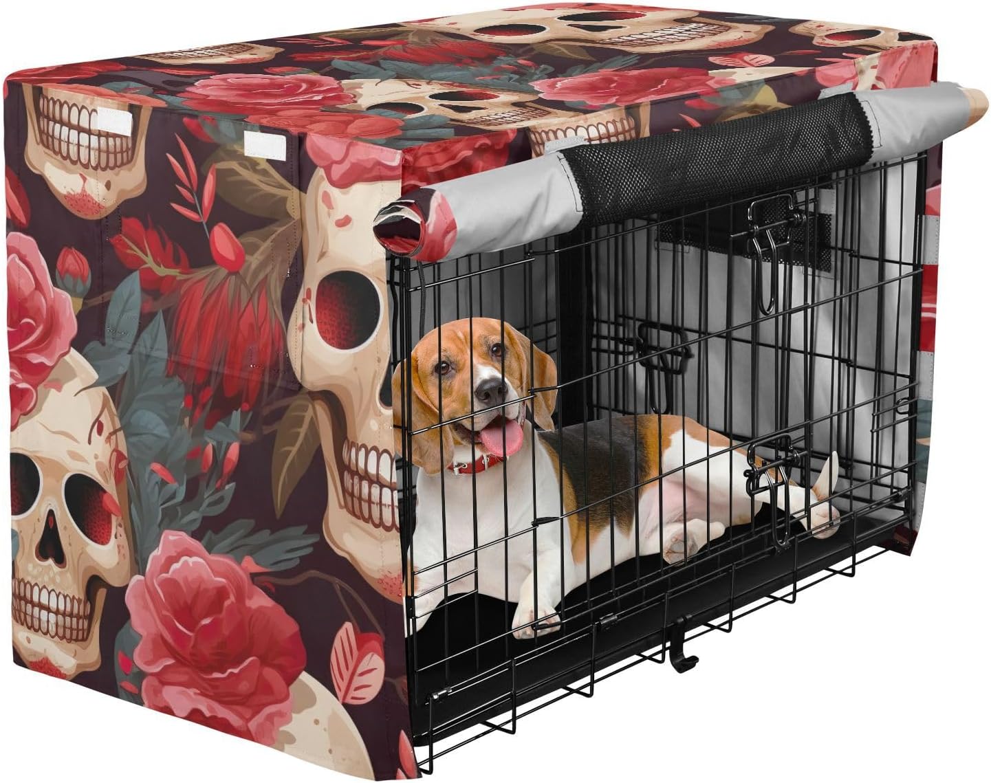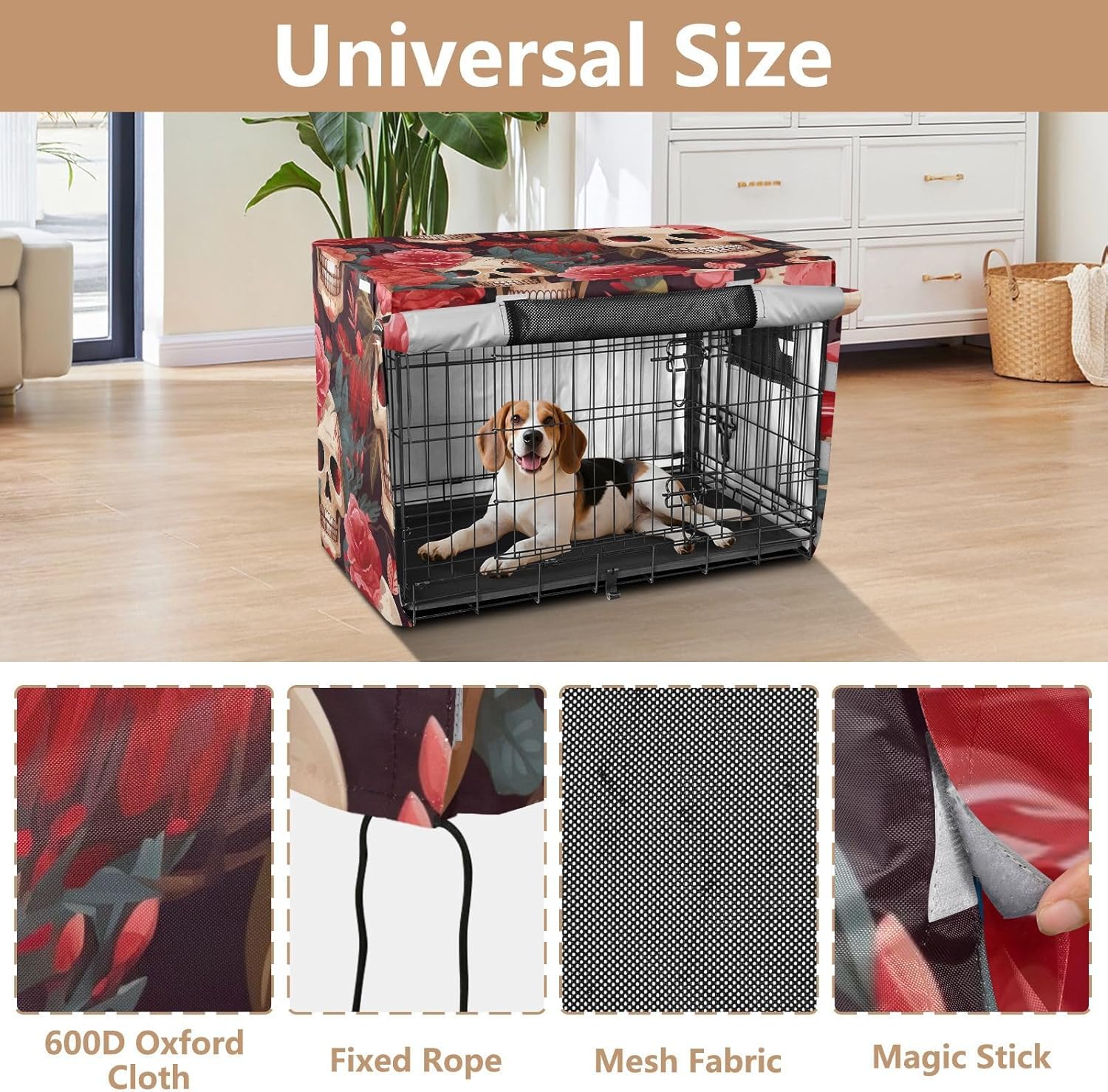 Protection – Made from 600D silver-coated oxford fabric, this indoor pet crate cover provides reliable protection against weather conditions, including wind and rain. It prevents your dog from scratching the crate and blocks harmful UV rays.Easy Installation – This pet cage cover features a user-friendly fastening system, allowing for quick installation without tools. It securely attaches to your dog crate, ensuring it stays in place for continuous protection.Effective Ventilation – Mesh windows on every side of the crate cover allow for steady airflow, keeping your dog comfortable and well-ventilated while inside. This design ensures your pet has a cool and breathable environment.Secure Fit – Equipped with four tie-down straps, the cover stays firmly in place, preventing it from shifting or being blown away. This added stability makes it suitable for outdoor use even in windy conditions.Ideal for Multiple Uses – This versatile pet kennel cover is Ideal for both indoor and travel use. Whether you’re at home, on a road trip, or camping, it offers a practical solution for protecting your pet’s crate.