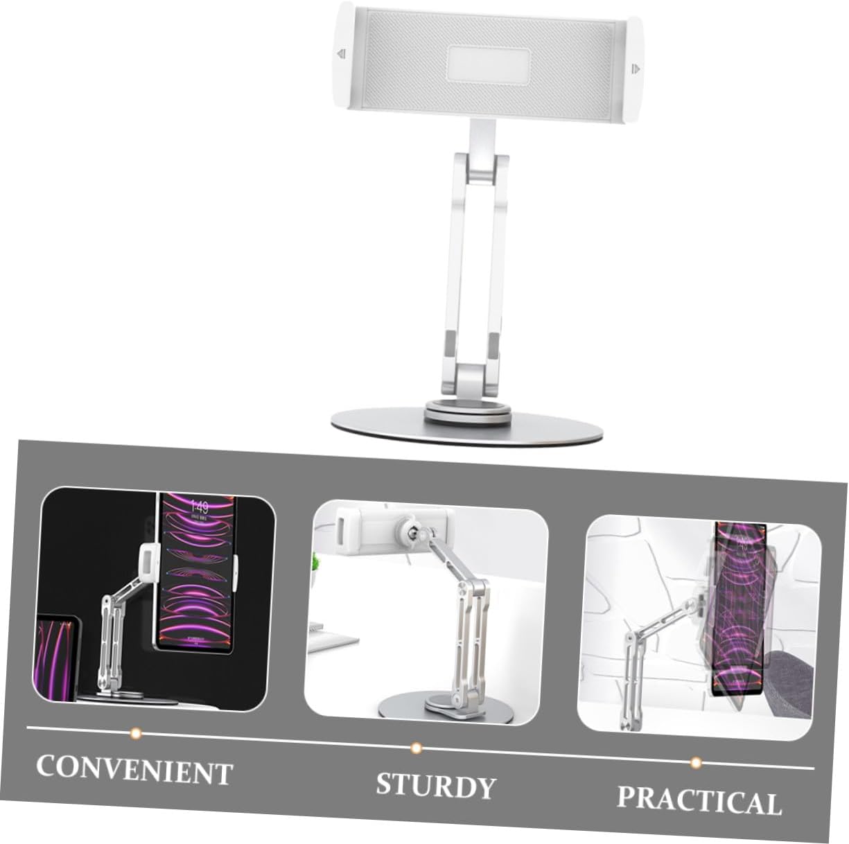 Package Include 1 x Tablet Holder Characteristics -Product Info:Aluminum alloy flat plate bracket - Size: 26.00X11.50X11.50cm/10.22X4.52X4.52in - Color: Silver -Clamp adjustable range: 13.5-26.5cm/5.31-10.43in mobile phone tablet holder -Material:ABS, aluminum alloy, silicone - Not easy to deform, smooth and beautiful, light weight design for you to take to any places you want desk tablet stand. - Perfect for home, bedroom, living room, office, dorm, school use, so can make your life more convenient tablet stand adjustable. - With strong compatibility, this adjustable holder can be suitable for most kinds of tablets adjustable tablet stand. - The bracket can be adjusted according to your use, very professional and practical, durable in use folding aluminum alloy tablet stand. - This tablet bracket is designed to free your hands while watching videos, listen to Musics, make a video call compact desktop tablet holder.Goods Descriptionfoldable desktop tablet stand This tablet holder is adjustable, can adjust to a comfortable sitting position.mobile phone tablet holder If you have to work with your tablet for a long time a day, you should take at our product.tablet stand foldable Versatile design allows for use in various settings, including home, office, or while traveling