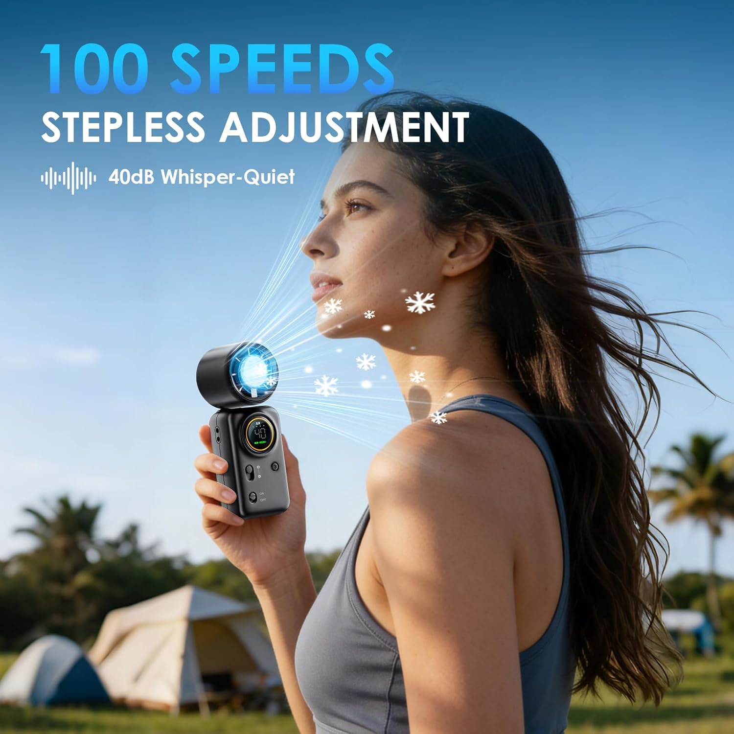 Redefining Personal Cooling: Where Innovation Meets PortabilityThe Portable Handheld Cooling Fan combined powerful airflow with active refrigeration technology, it delivers a cooling experience that ordinary fans simply cannot match.Advanced Cooling TechnologyAt the heart of this device lies a semiconductor cooling plate that actively chills the air as it passes through. Our handheld fan rechargeable creates a genuine temperature drop—ideal for post-workout cool-downs, or simply surviving a scorching day at an outdoor concert.The 20000RPM turbo motor delivers serious wind speed while maintaining impressively low noise levels. At its quietest setting, it's virtually silent—perfect for office use or library study sessions. Built for Real-World AdventuresThe robust construction withstands the bumps of daily travel, while the portable design ensures it's always within reach. Whether you're navigating crowded theme parks, relaxing on sandy beaches, or working through a heatwave at your desk, this fan adapts to your needs. It's the camping essential you never knew you needed, the cruise essential that keeps you comfortable on deck, and the beach essential that fits in your bag alongside sunscreen and towels.Intuitive Controls, Total VisibilityThe bright LED display eliminates guesswork. At a glance, you'll know your exact speed setting and remaining battery percentage. The 100-speed stepless adjustment lets you fine-tune airflow with precision, from a delicate breeze for reading to a powerful gust for cooling down after exercise.