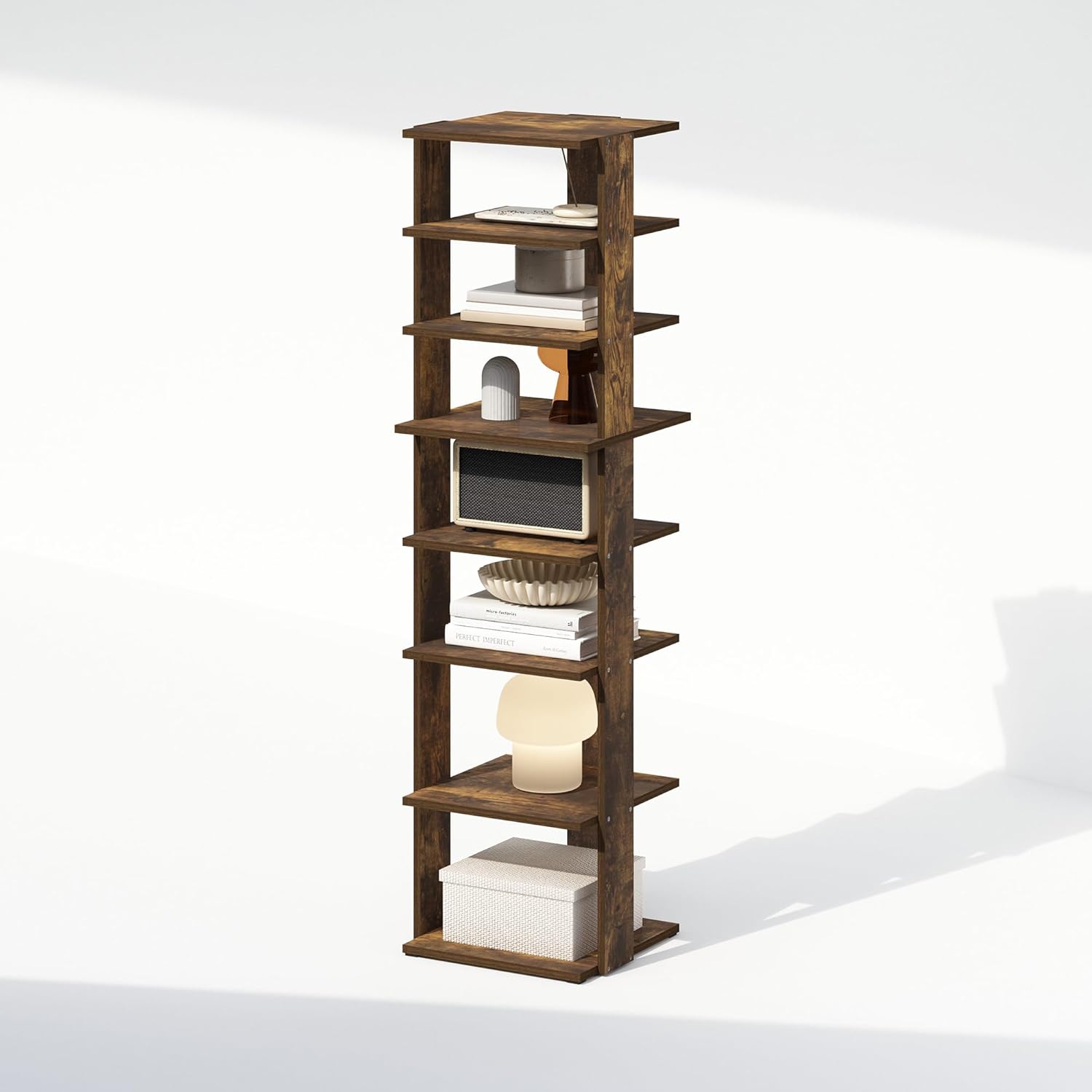 Maximize your corner space with the Furinno Econ 8-Tier Corner Shelf Bookcase, a sleek and functional solution for organizing books, décor, and everyday essentials. Designed to fit snugly into any corner, this bookcase features eight sturdy shelves crafted from durable, CARB-compliant composite wood, each capable of supporting up to 5 lbs. Its minimalist design and variety of finishes make it a versatile addition to any room, seamlessly blending with modern, minimalist, or transitional interiors. The Corner Shelves is made of CARB-grade composite wood tested for durability and sturdiness. Assembly is easy with provided step-by-step instructions. Care instructions: wipe clean with a clean damped cloth. Avoid using harsh chemicals. Pictures are for illustration purposes. All decor items are not included in this offer. The product is entitled to a 1-year warranty against manufacturer defects. Fits Space, Fits Budget.