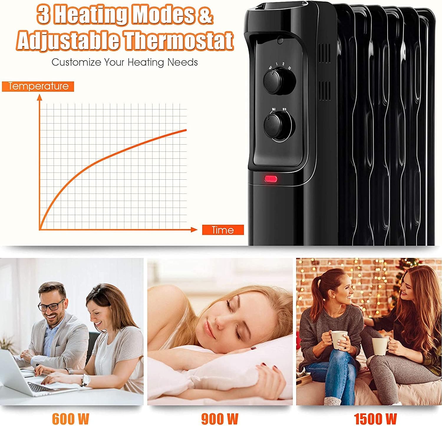 Description: Our oil filled heaters not only save energy but also guarantee safety! If you are looking for a heater, then choosing our portable electric heater will be a wise choice. Our oil filled radiator heater provides energy-efficient heating for medium to large rooms that need constant heat in the winter. And it helps to save electric bills by heating the whole house through air circulation. Plus, widened bottom of the support heater can prevent the heater from easily toppling. And when cold season passed, you can take the base off and wrap the cord in the front of the heater, which ensures tidy and make the storage more easier. We can assure you that:No matter you have any questions, you can send emails to us at any time. The reply will be sent within 24 hours. Features: ✔️Features with 3 heat settings (600W/ 900W/ 1500W) ✔️No noise at work will not disturb your work or sleep ✔️Widened bottom design prevents accidental dumping of the heater ✔️Premium steels has great heating conductivity, stability and strength ✔️Energy saving design can reduce heating constantly and costs ✔️Equipped with permanently sealed oil, no longer refilling ✔️Cord storage bracket ensures the tidiness ✔️4 universal wheels and front handle facilitate movement ✔️Adjustable temp can be set easily by twist button ✔️Suitable for bedroom, living room, study, office Specifications: Color: White / Black Material: Iron Net Weight: 15.5 lbs Product Dimension: 13” x 10” x 25” (L x W x H) Wire Length: 79" Input: 120V, 60Hz Power: 600W / 900W /1500W Package Includes: 1 x Oil-filled Heater 4 x Universal Casters 1 x User Manual
