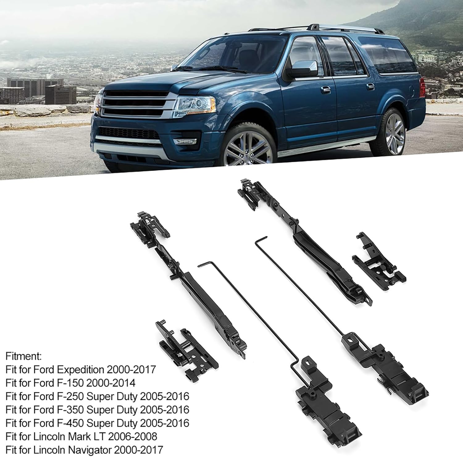Spec: Item Type: Sunroof Repair Kit Material: ASB Plastic + Steel Color: Black Fitment: for Expedition 2000-2017 for 2000-2014 for Super Duty 2005-2016 for Super Duty 2005-2016 for F450 Super Duty 2005-2016 for Mark LT 2006-2008 for Navigator 2000-2017 Package List: 2 x Lifting Arm 2 x Cam Bracket 2 x Groove r 8 x Rivet 1 x Synthetic Grease 1 x Grease Applicator 1 x Instruction